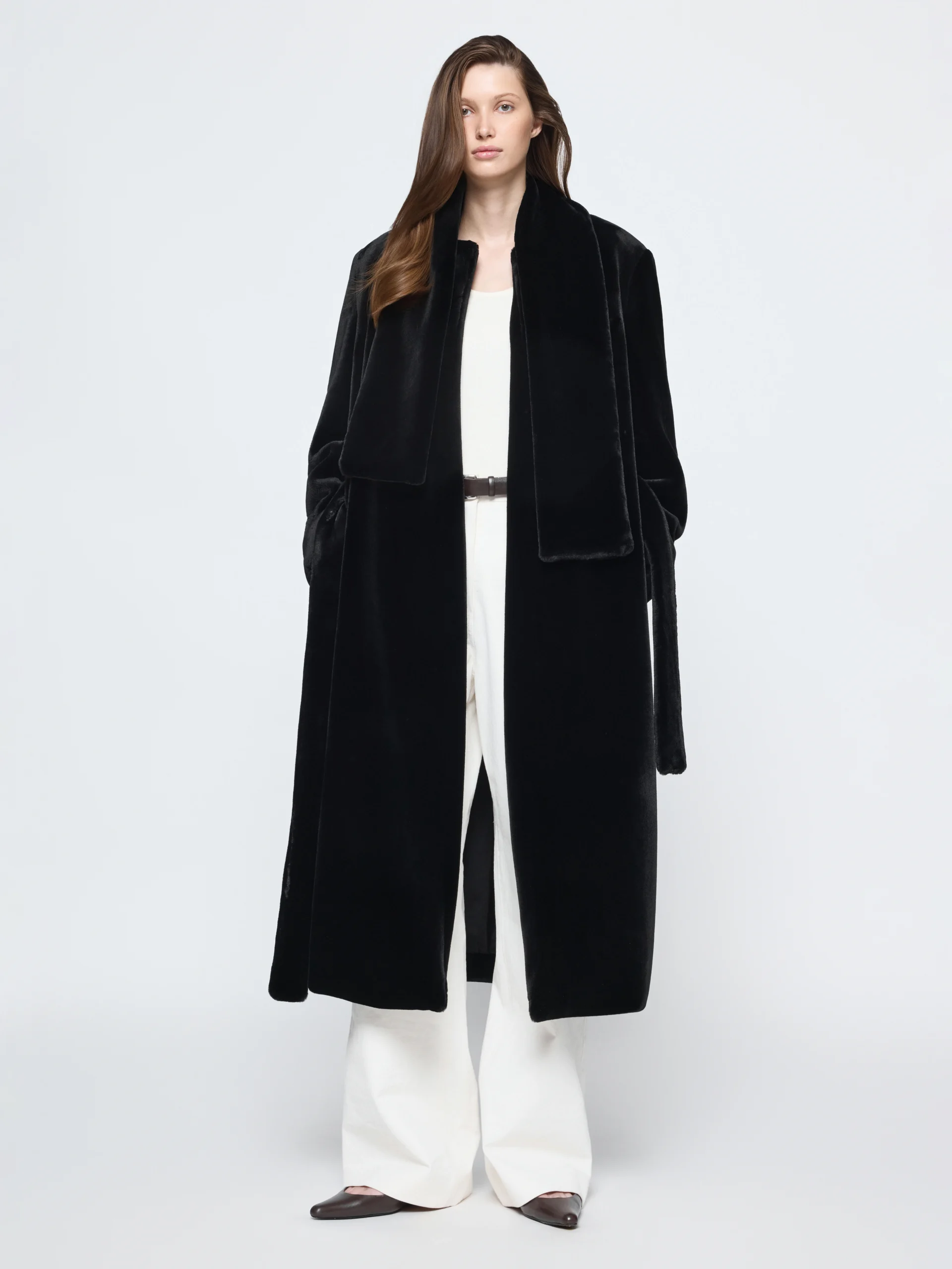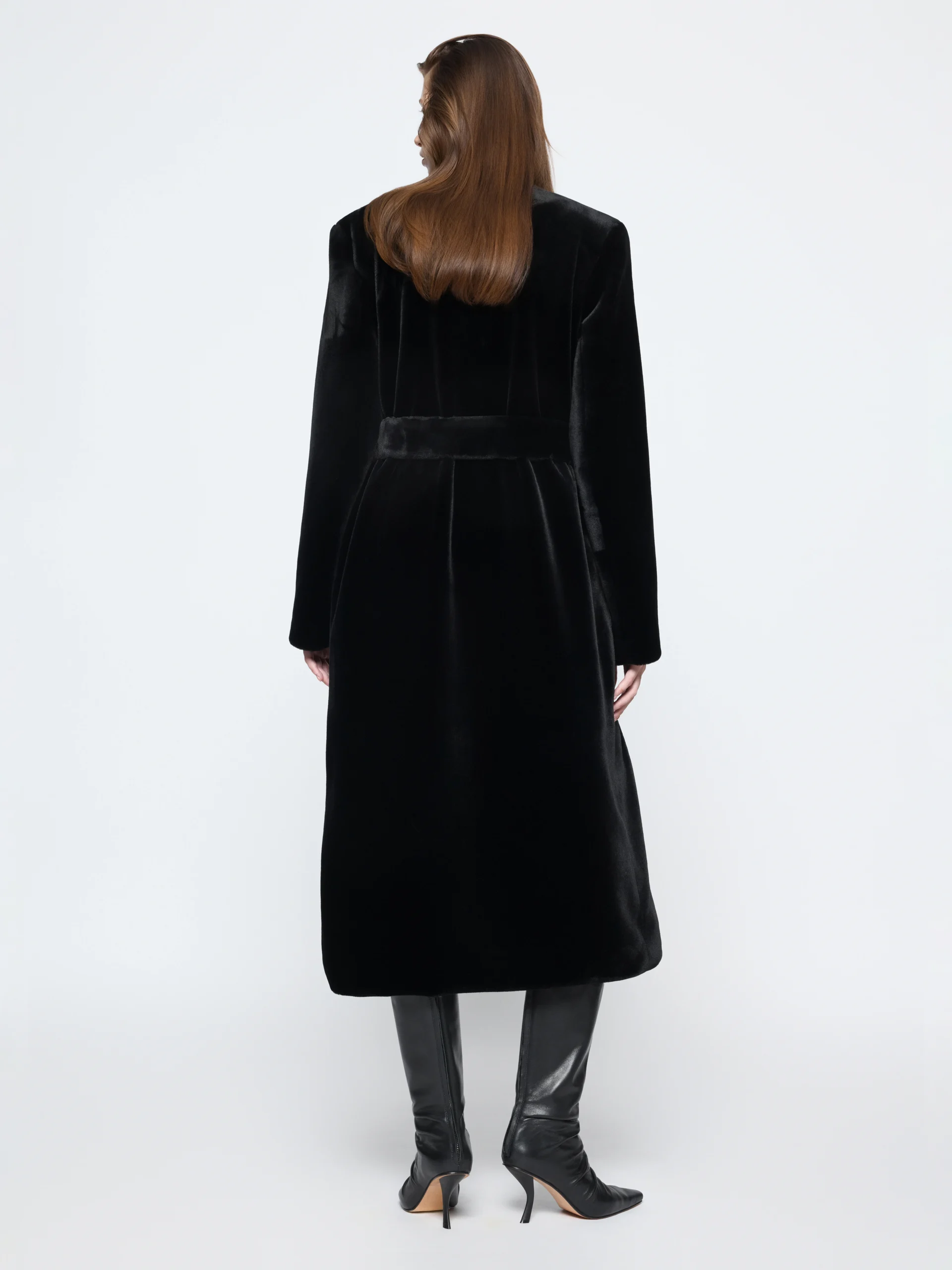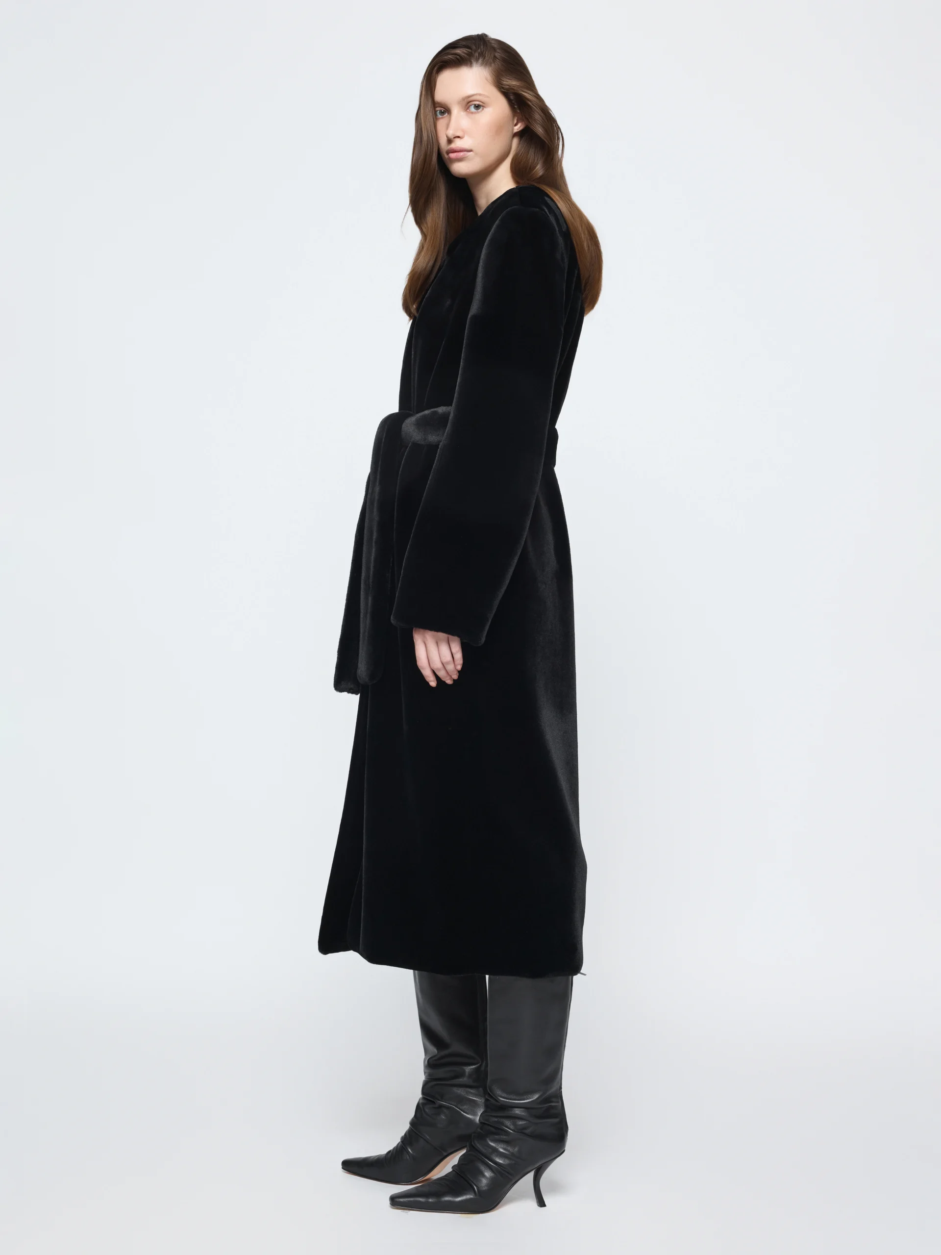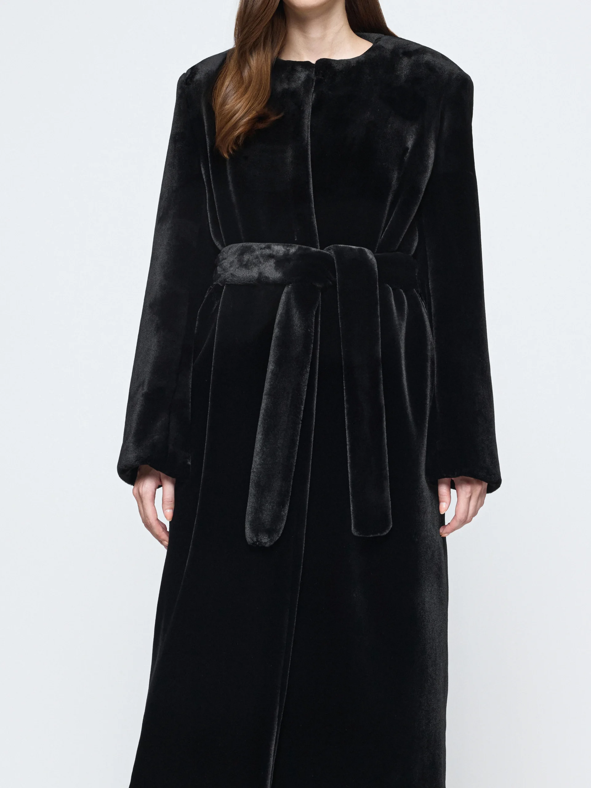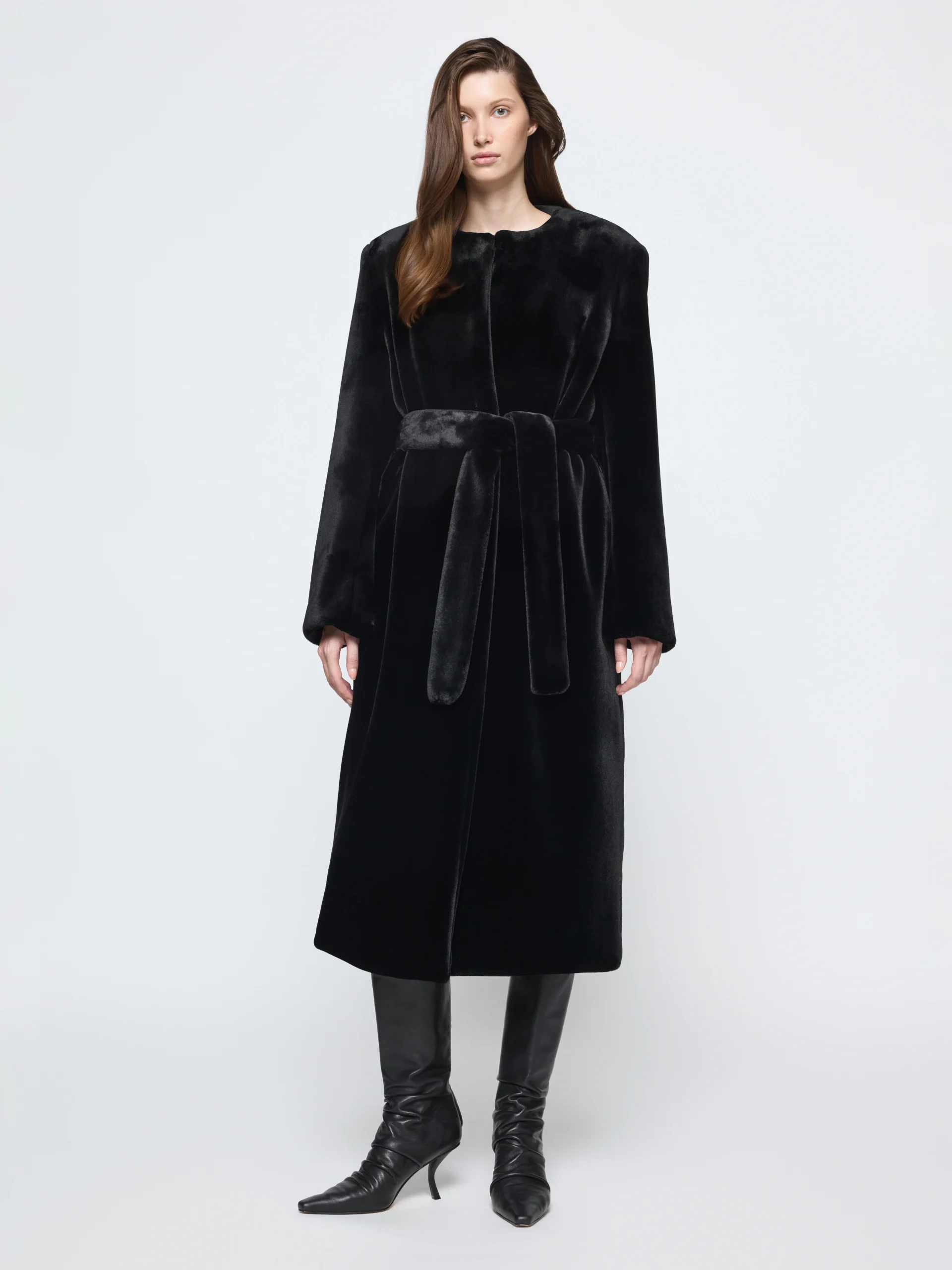In faux fur with a smooth silk lining, the Gia Studios “Bellus” coat carries a soft weight and straight line. The round neck and optional belt create a shape that holds its place over time.
