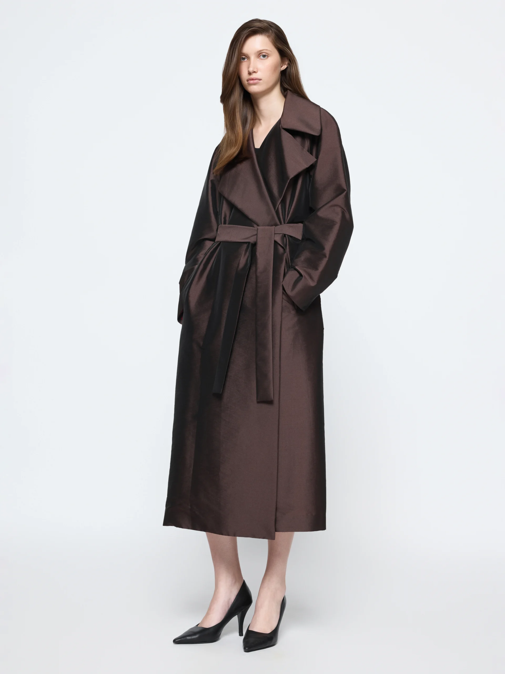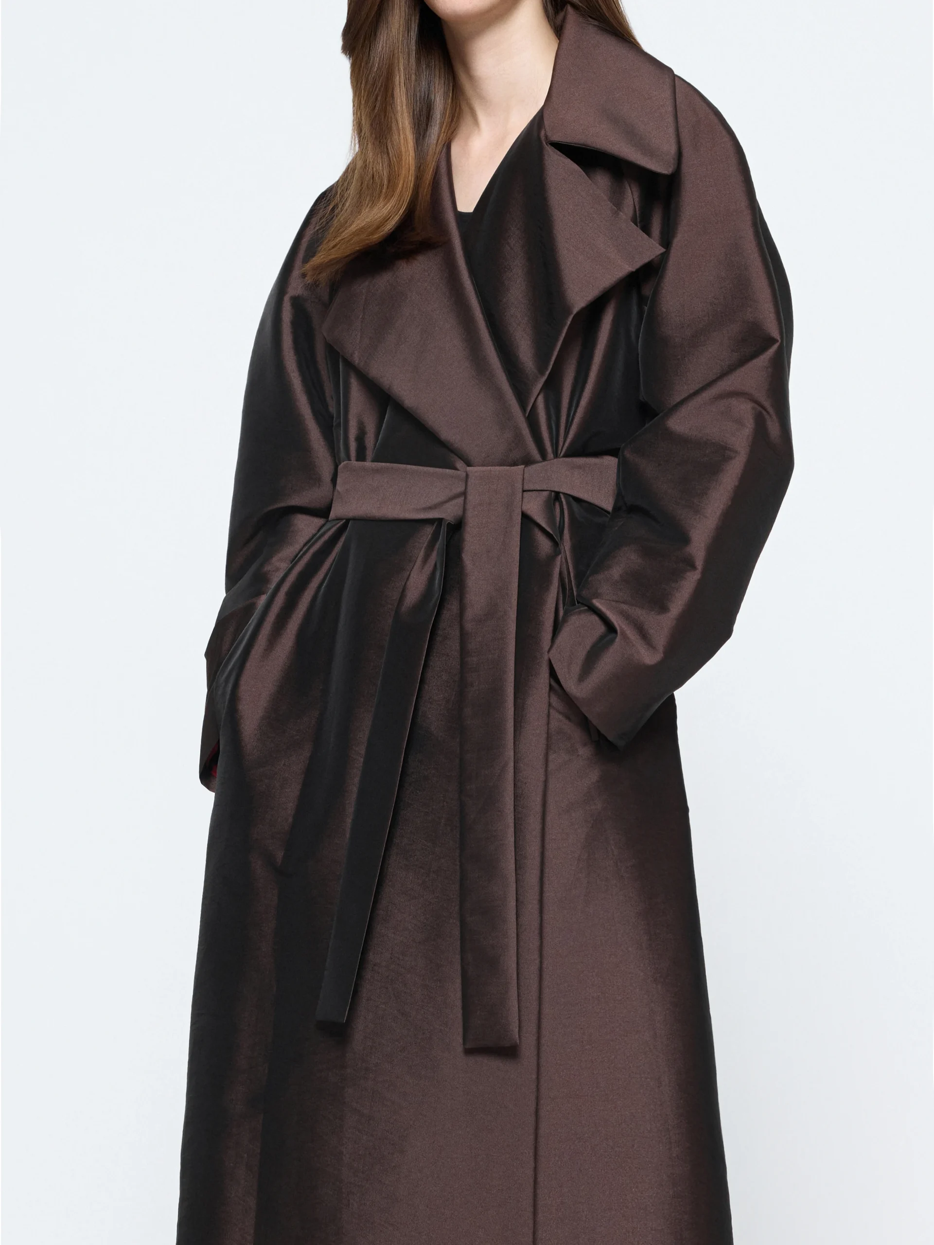 A wide lapel, straight hem, and raglan sleeves shape the Bordeaux coat into a frame that falls below the knee. Shown in deep Bordeaux or brown, it layers easily through shifting weather, from crisp mornings to cooler nights.