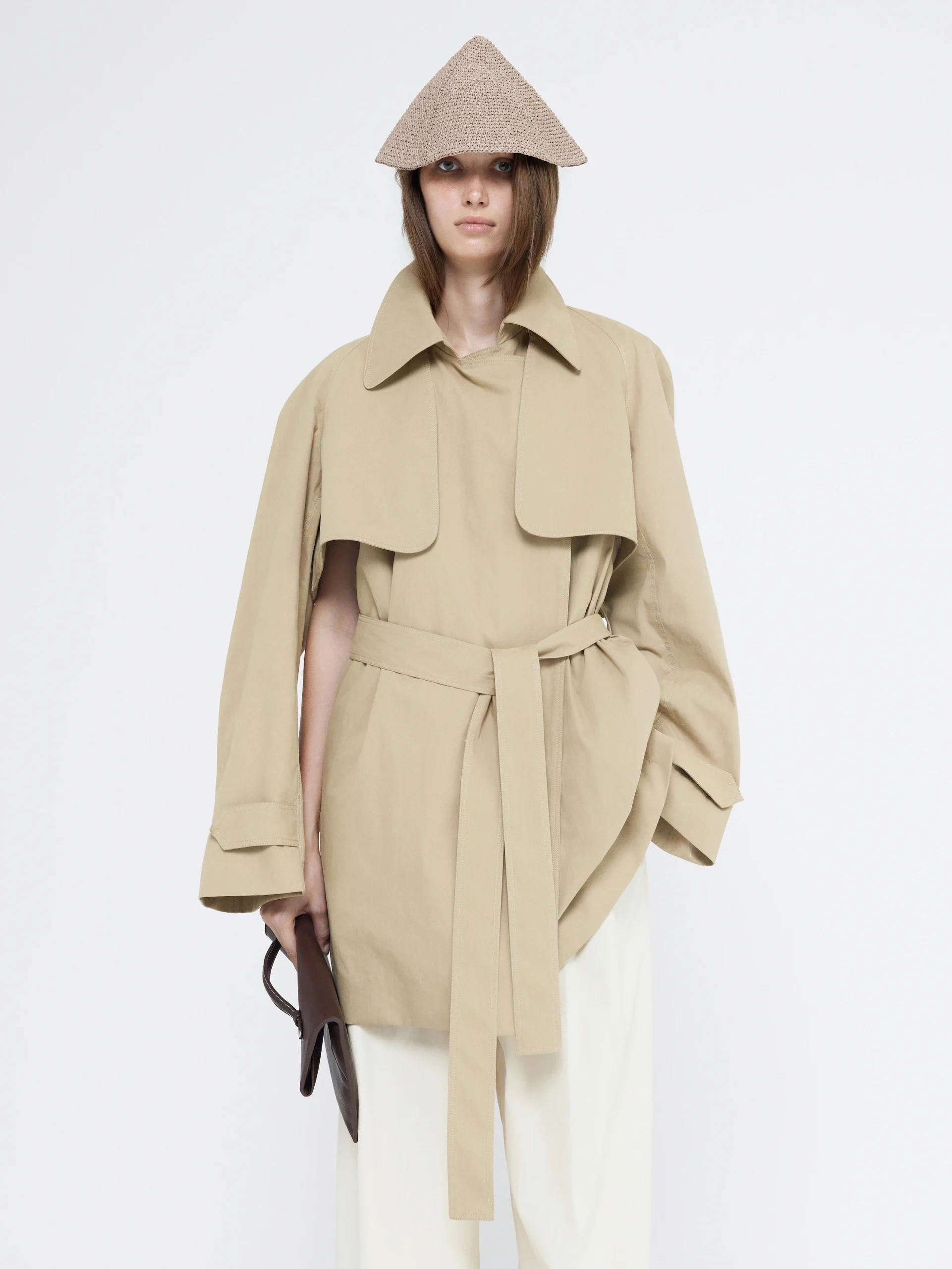 Soft cotton and silk let the Carmy split trench coat layer lightly while keeping warmth, while raglan sleeves and a belt let it drape or cinch for versatile styling over trousers or skirts.