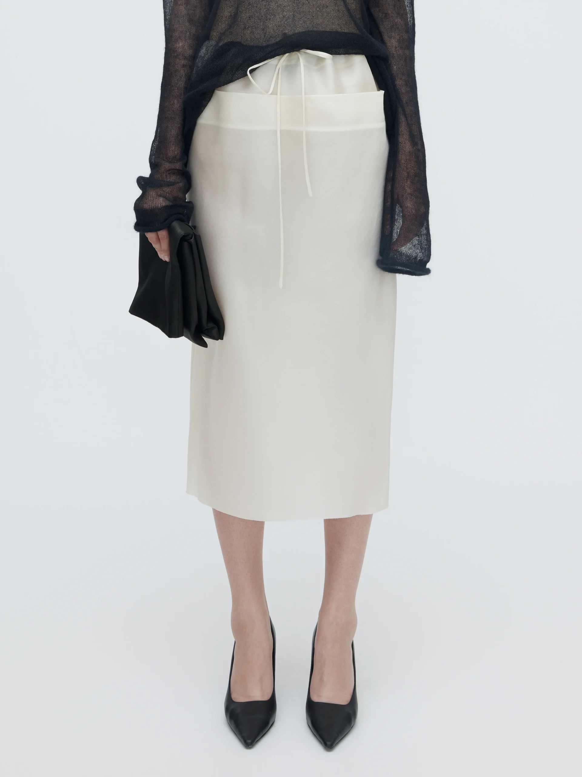 The ‘Chiêu’ skirt flows in soft Vietnamese silk, forming a clean column silhouette. A drawstring waist lends steady, easy comfort.