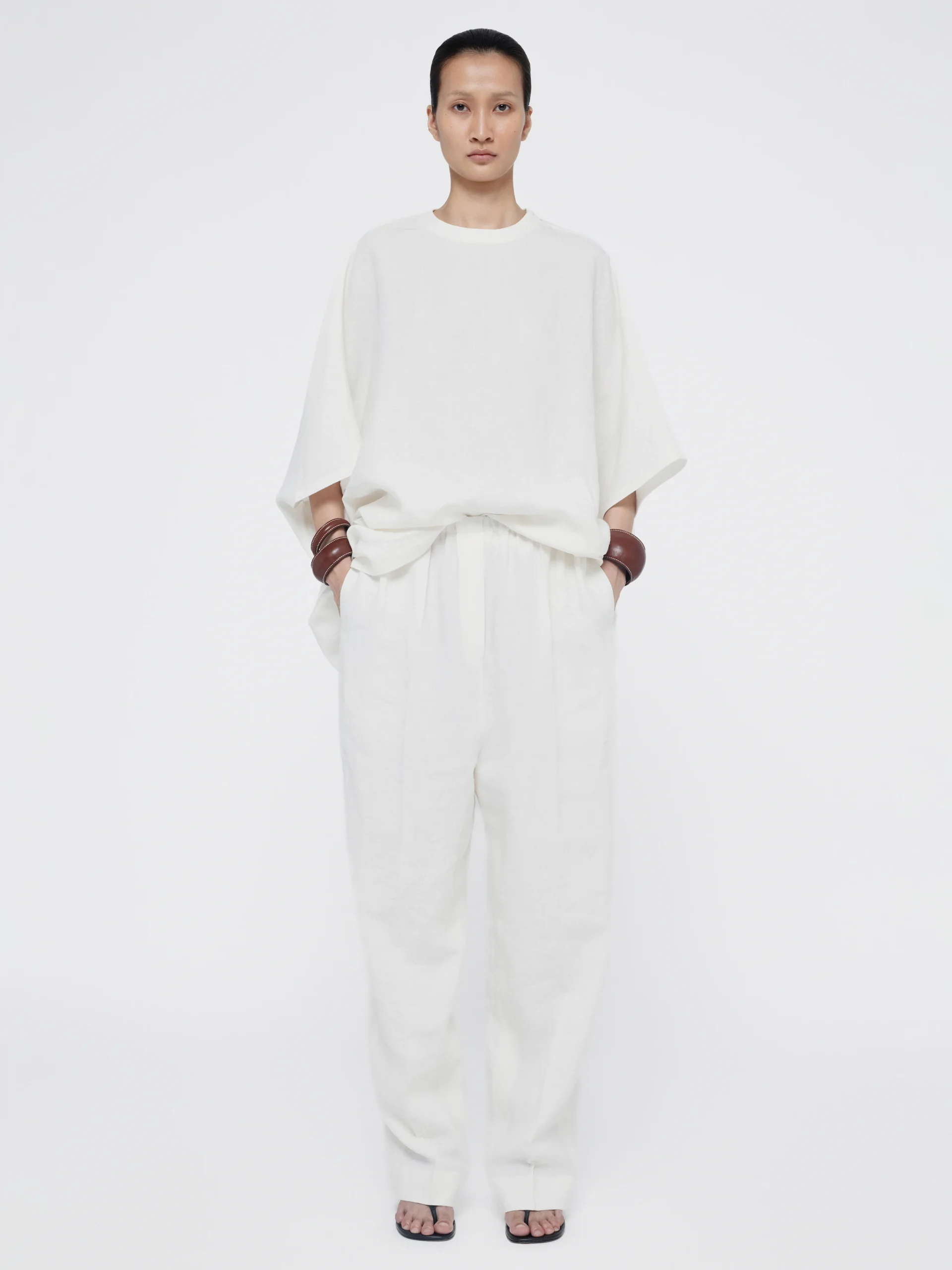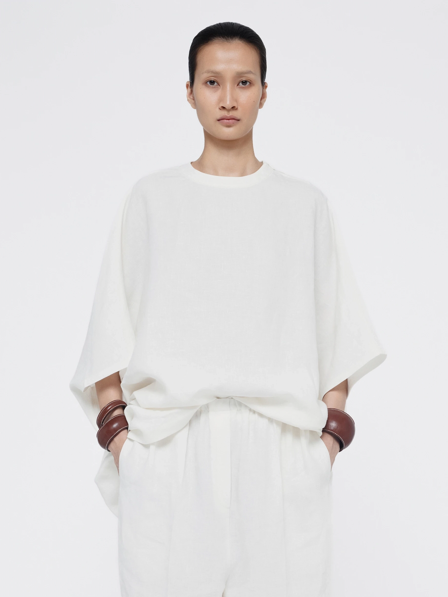 There’s a certain ease to linen when it’s left to fall naturally. This Dolman blouse lets the fabric settle around the frame, with sleeves extending just past the elbow.