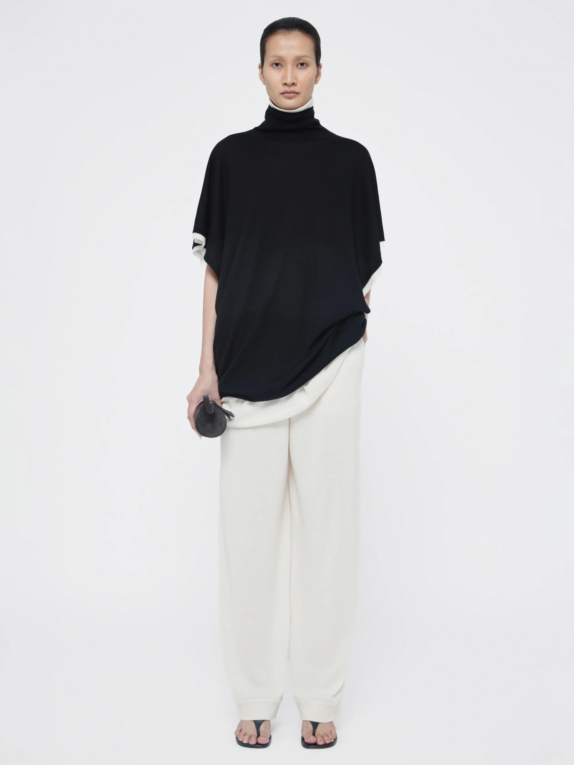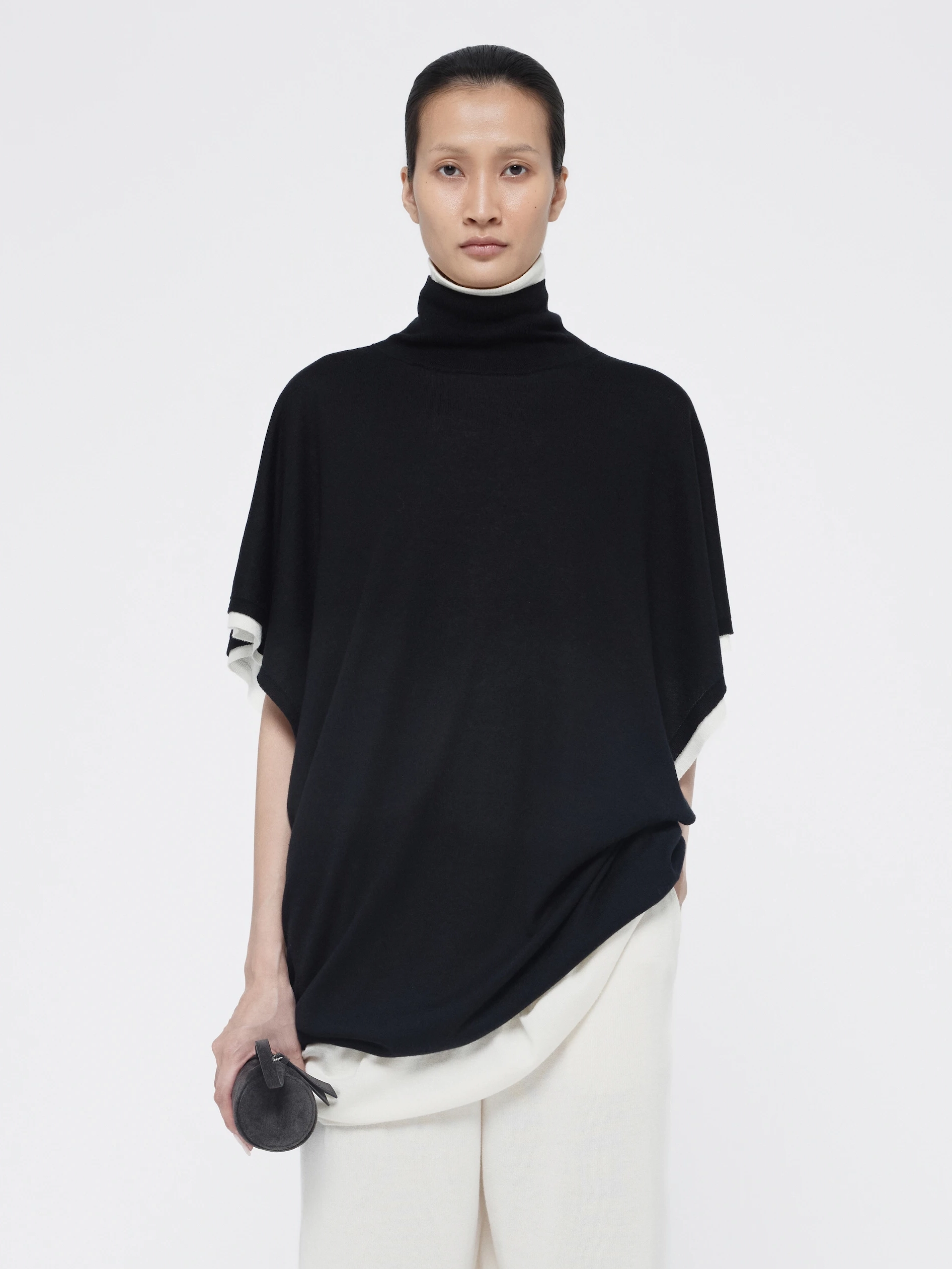 Defined by a high mock neck, fitted collar, and sleeveless batwing silhouette, Dolman Turtleneck Top can be styled in a double-layered look, suggested by GIA STUDIOS, for a modern twist.