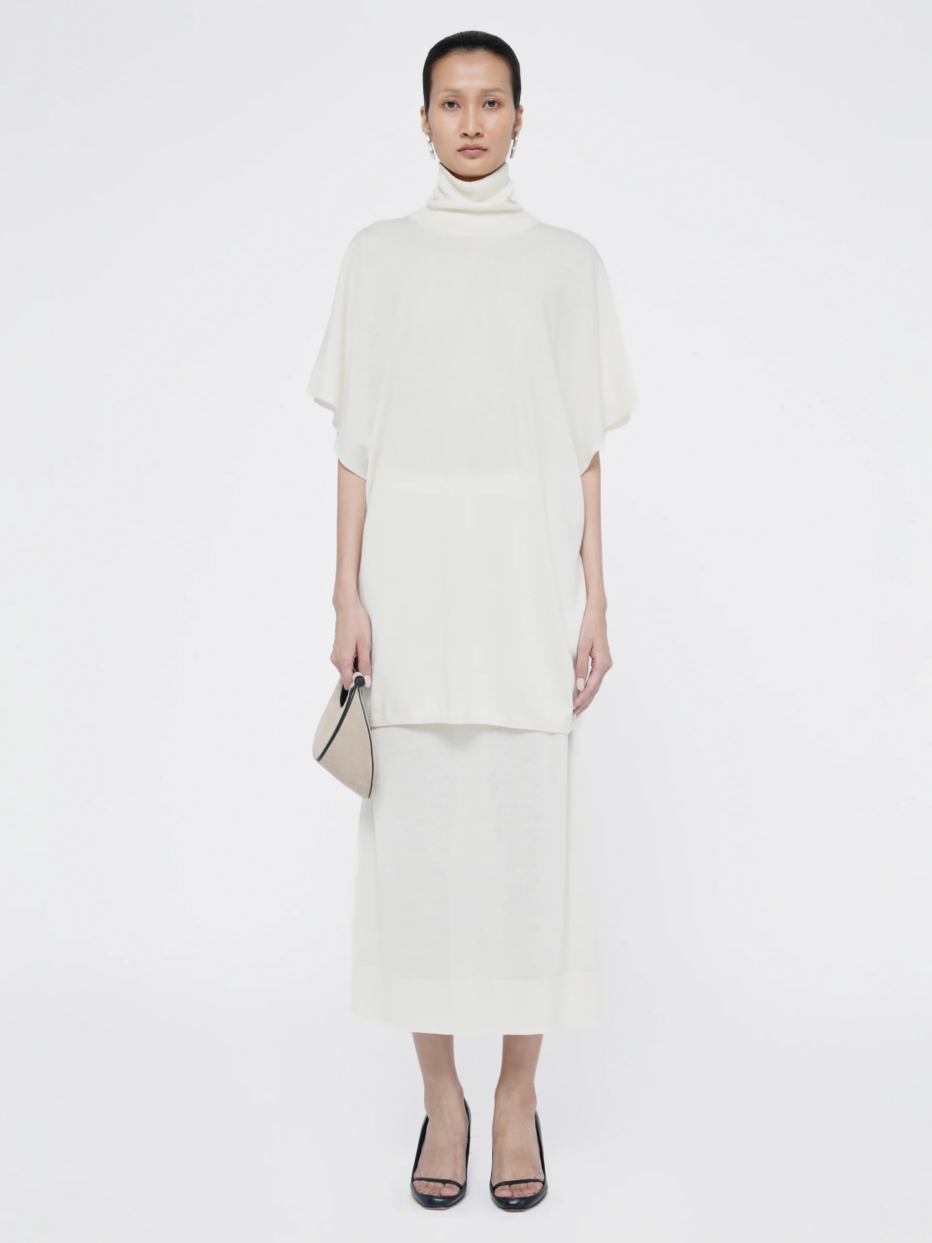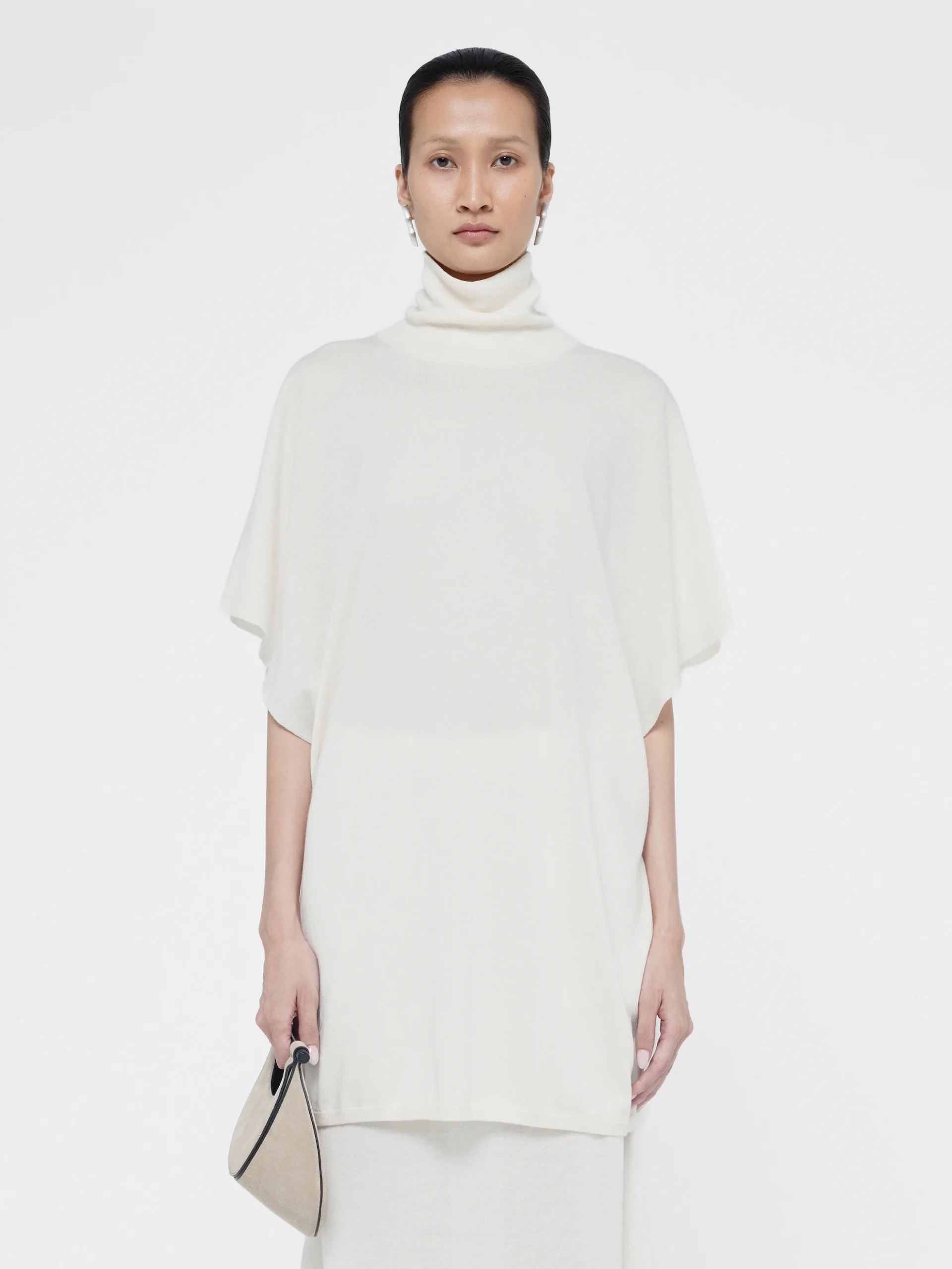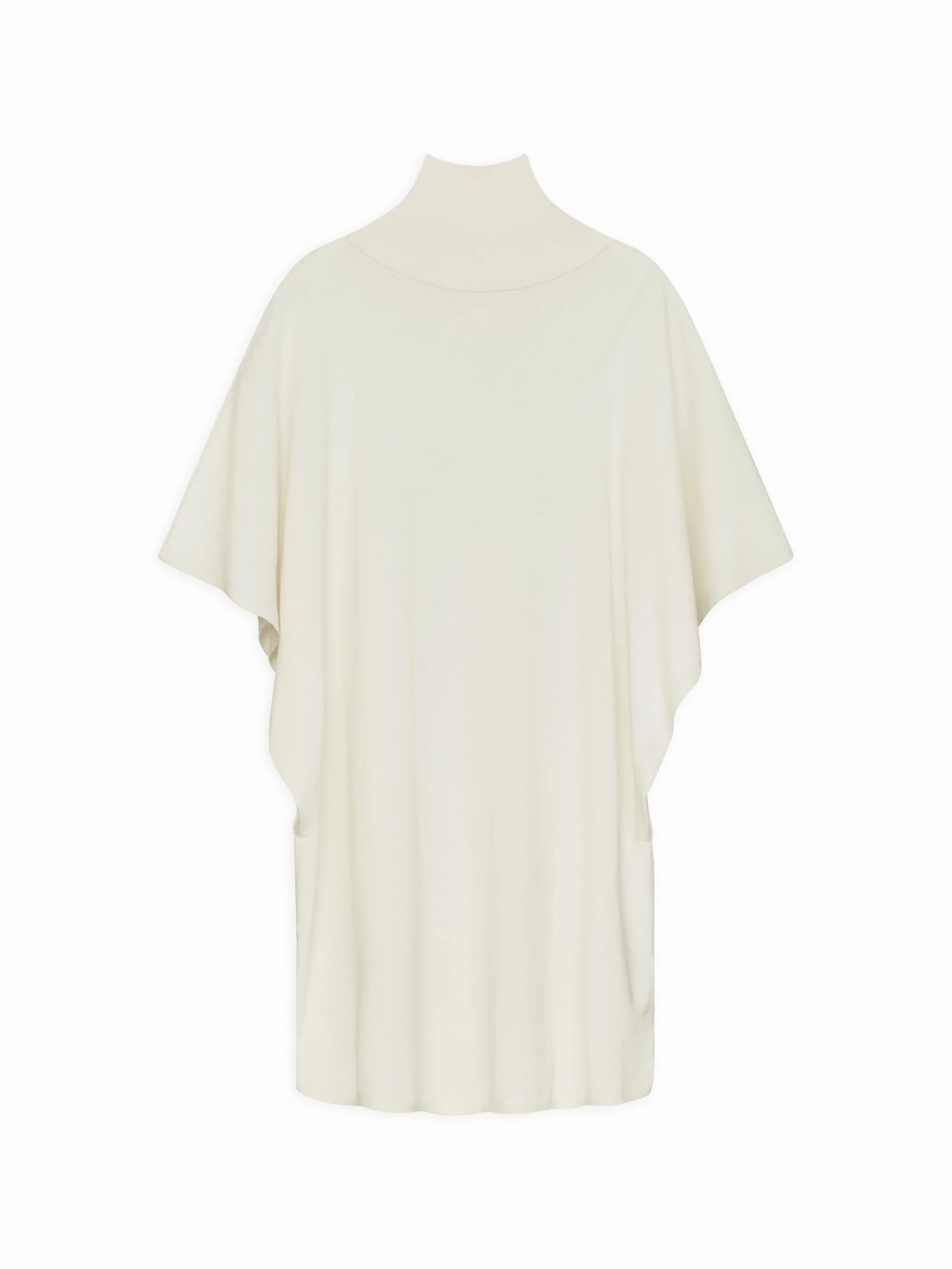 Defined by a high mock neck, fitted collar, and sleeveless batwing silhouette, Dolman Turtleneck Top can be styled in a double-layered look, suggested by GIA STUDIOS, for a modern twist.