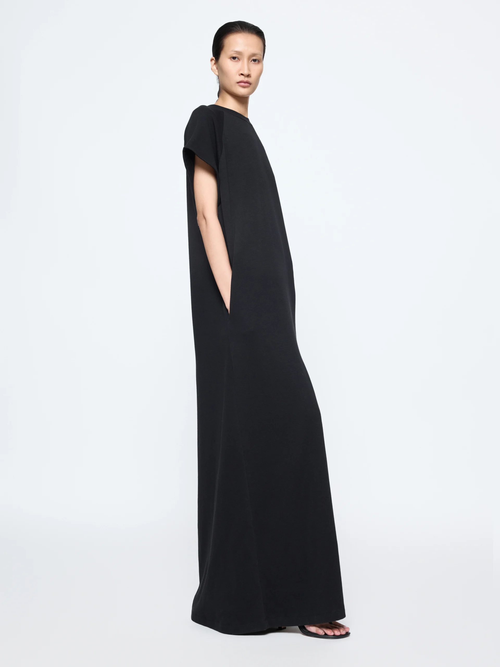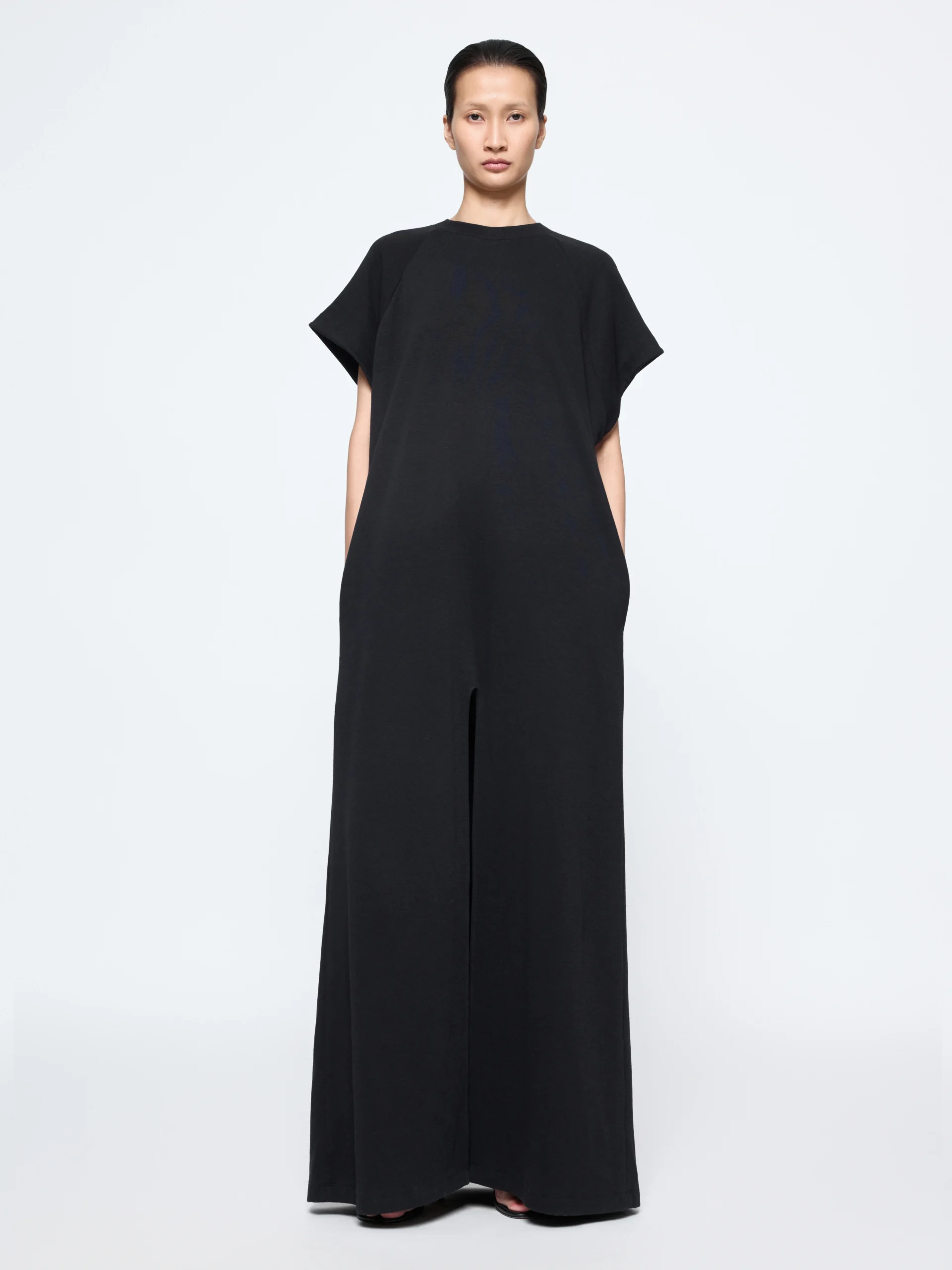 Short sleeves cut straight from the shoulder and a high crew neck frame the Gia Studios “Drix” tee. Its cotton-based fabric mix holds shape while allowing movement through curved leg openings.