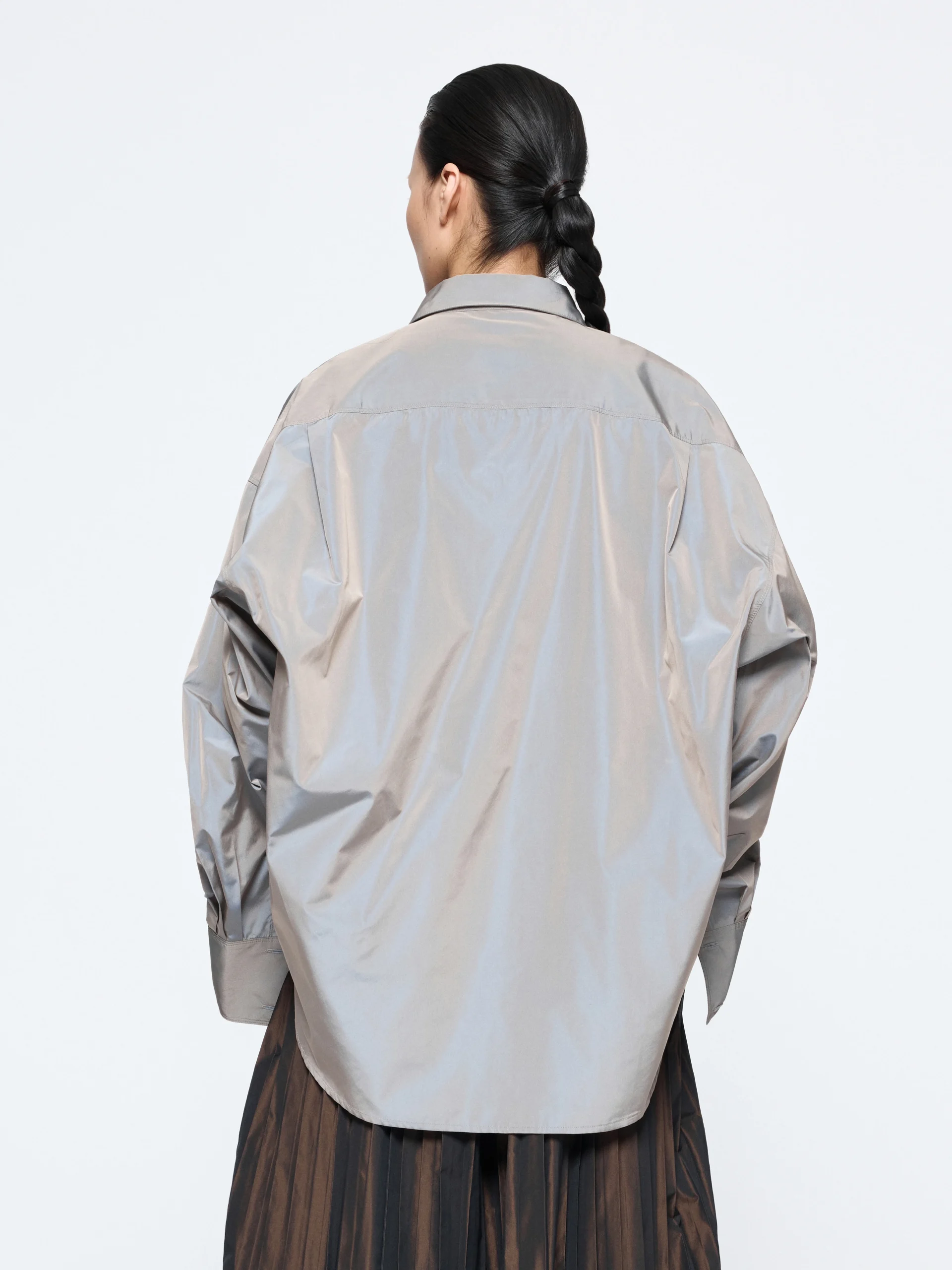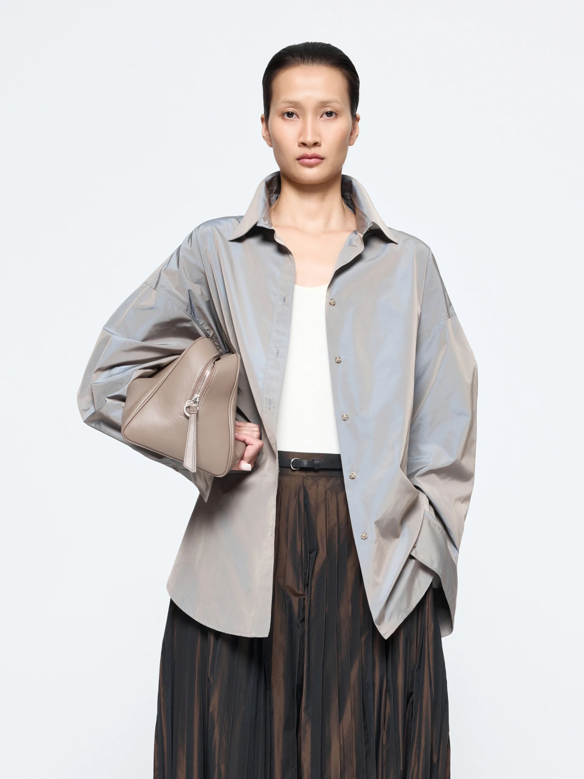 In cedar-toned brown or light blue taffeta, the Gia Studios “Ease” shirt drapes with a light structure that skims the body. The dropped shoulder and curved hem allow it to shift fluidly between tailored and casual settings.