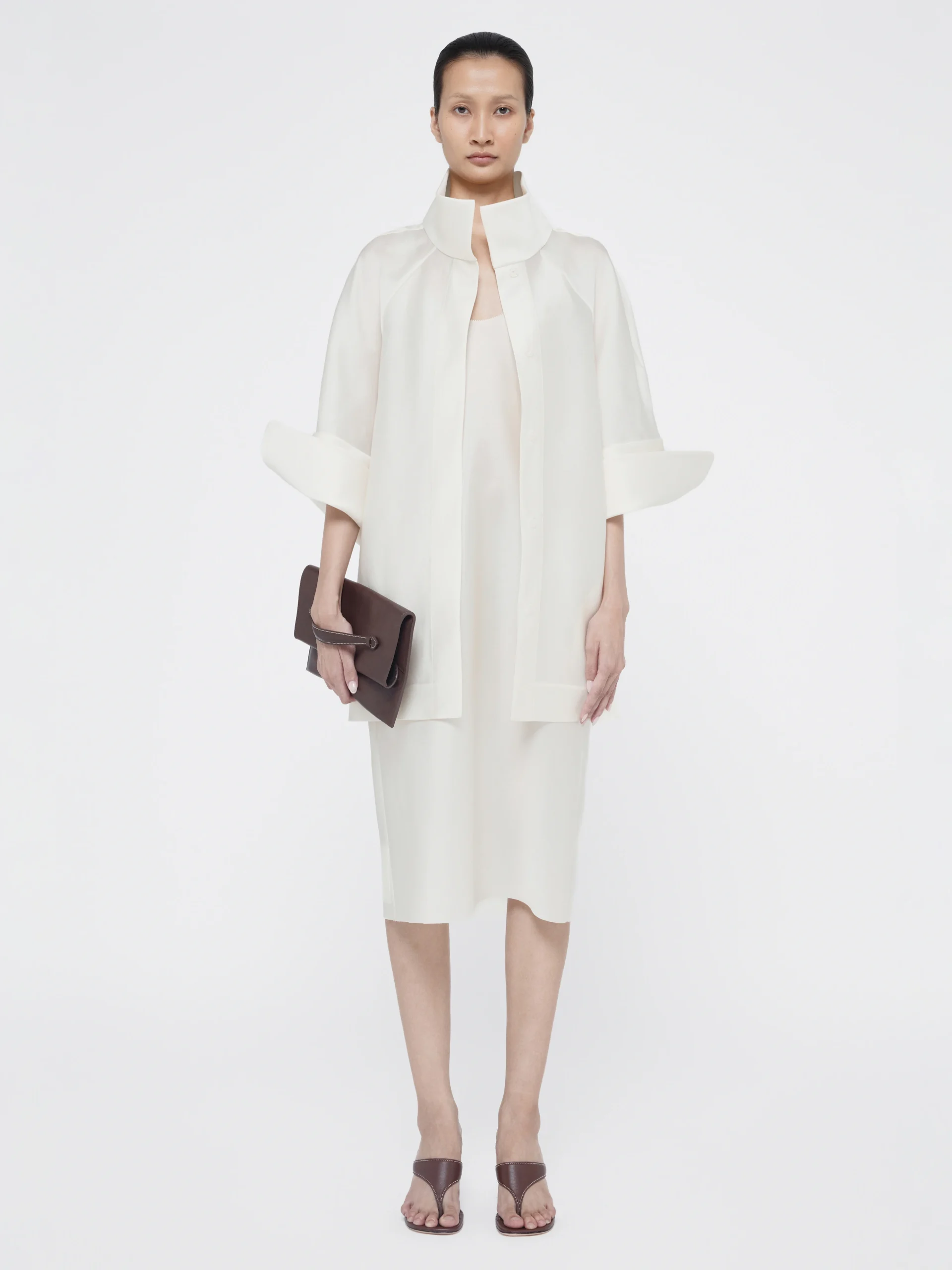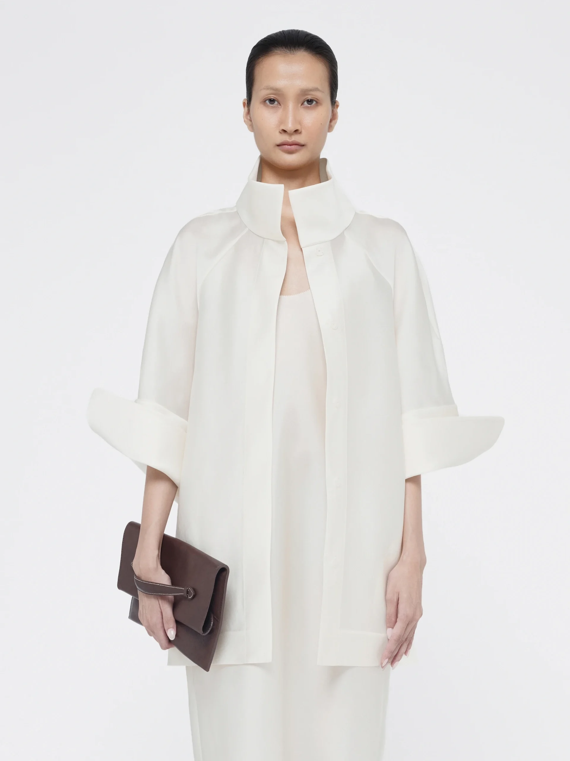 Vietnamese silk flows along the raglan sleeves and oversized cuffs. The Elio jacket falls past the hip, easily layered over an Elio dress as Gia Studios suggests.