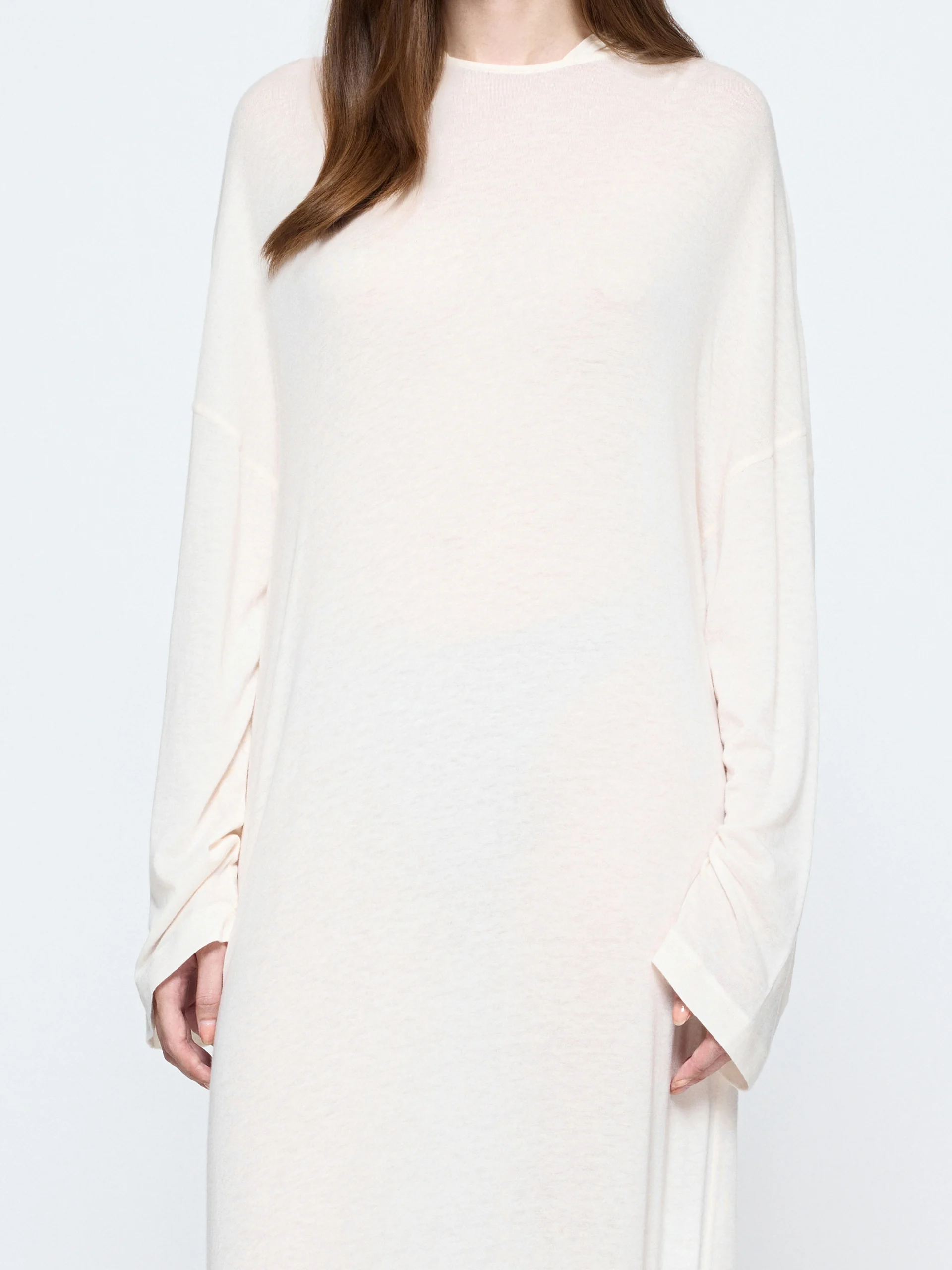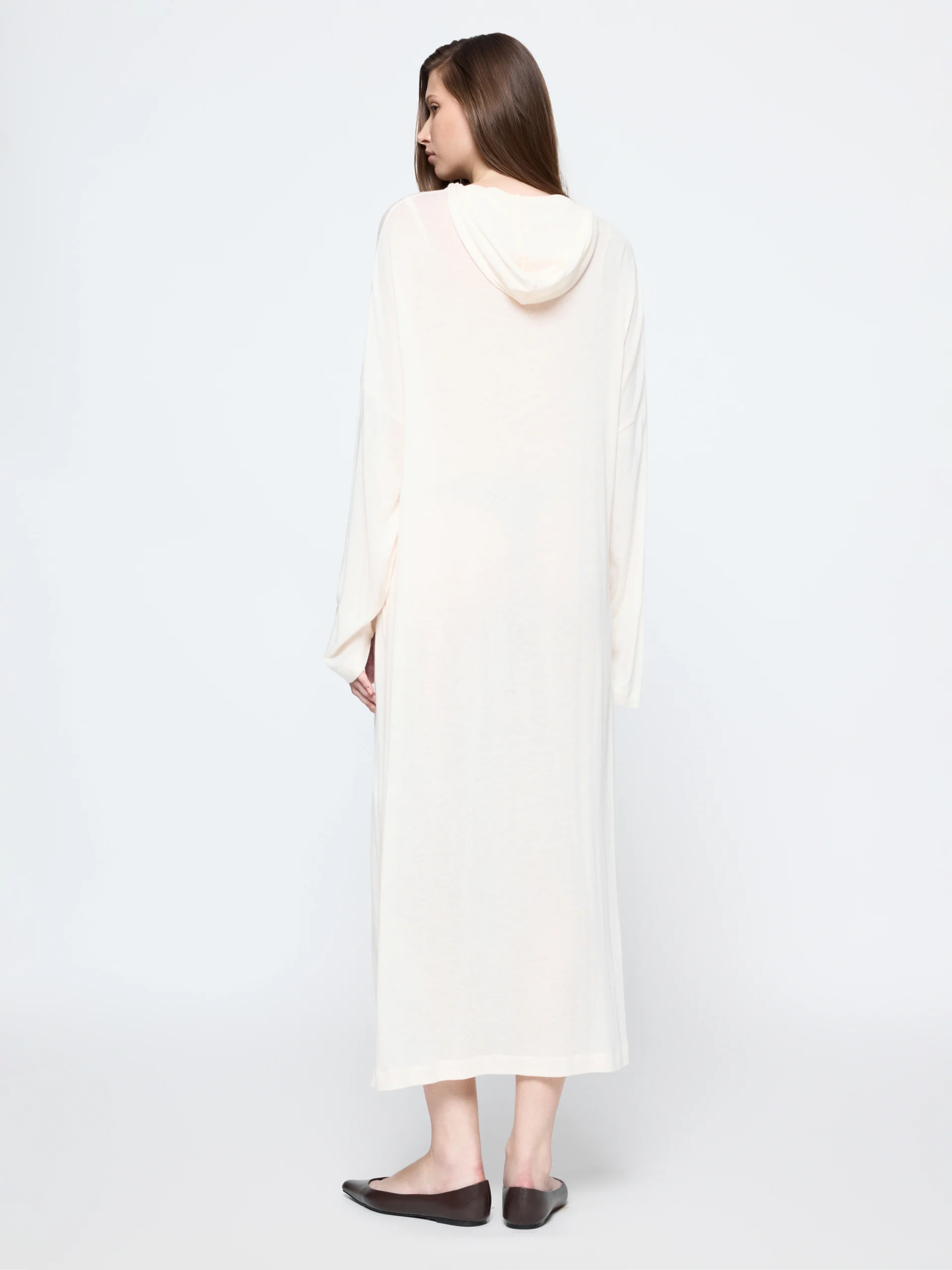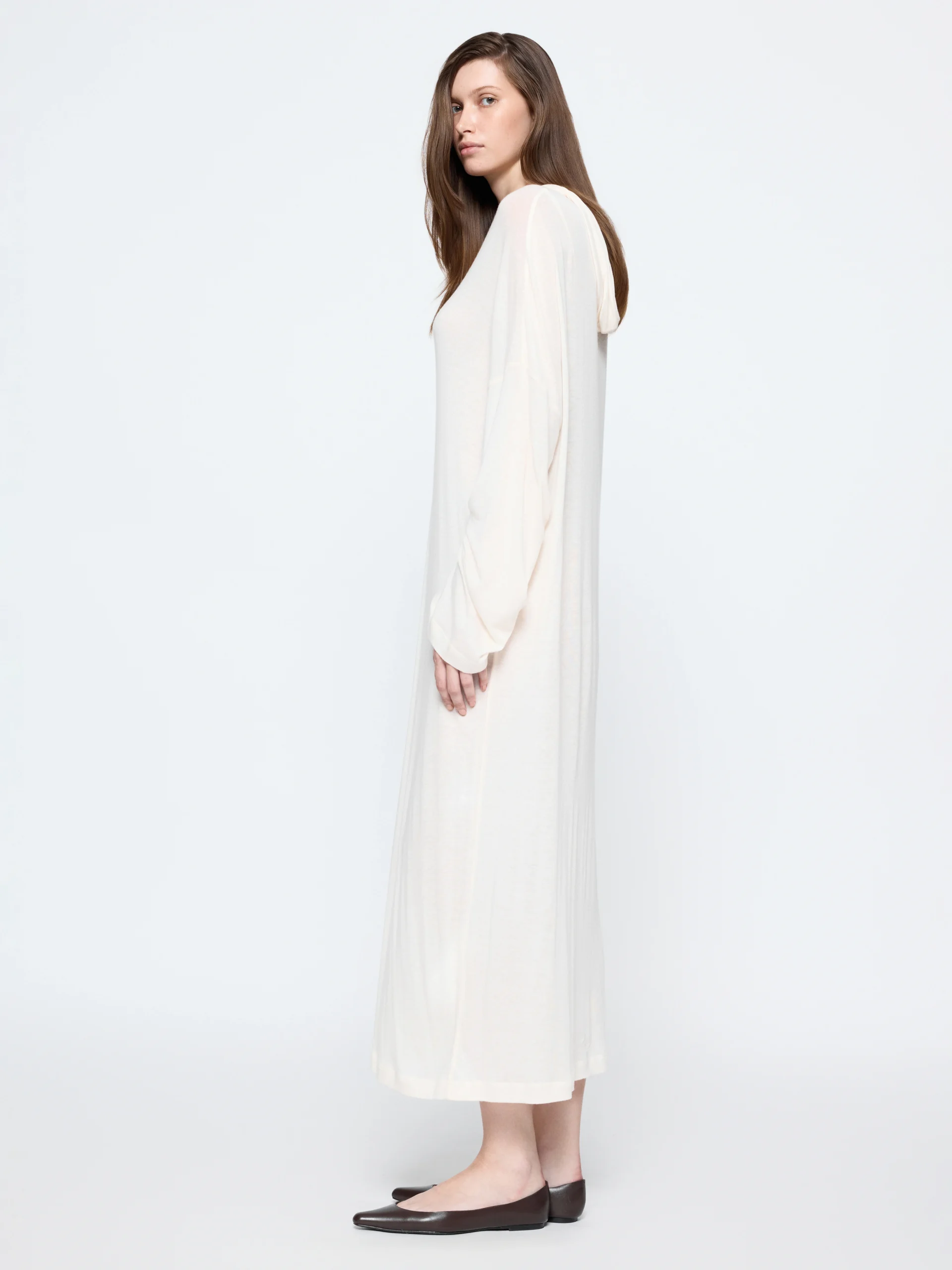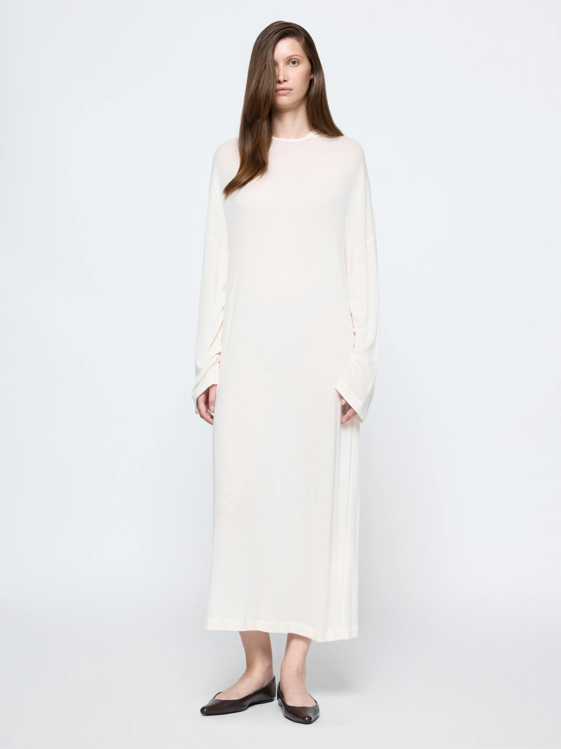 The Gia Studios “Frey” dress carries a wide cut that narrows slightly at the back with subtle shaping seams. Falling past the calf, it moves lightly and offers an ease that fits into everyday wear with sneakers or flats.