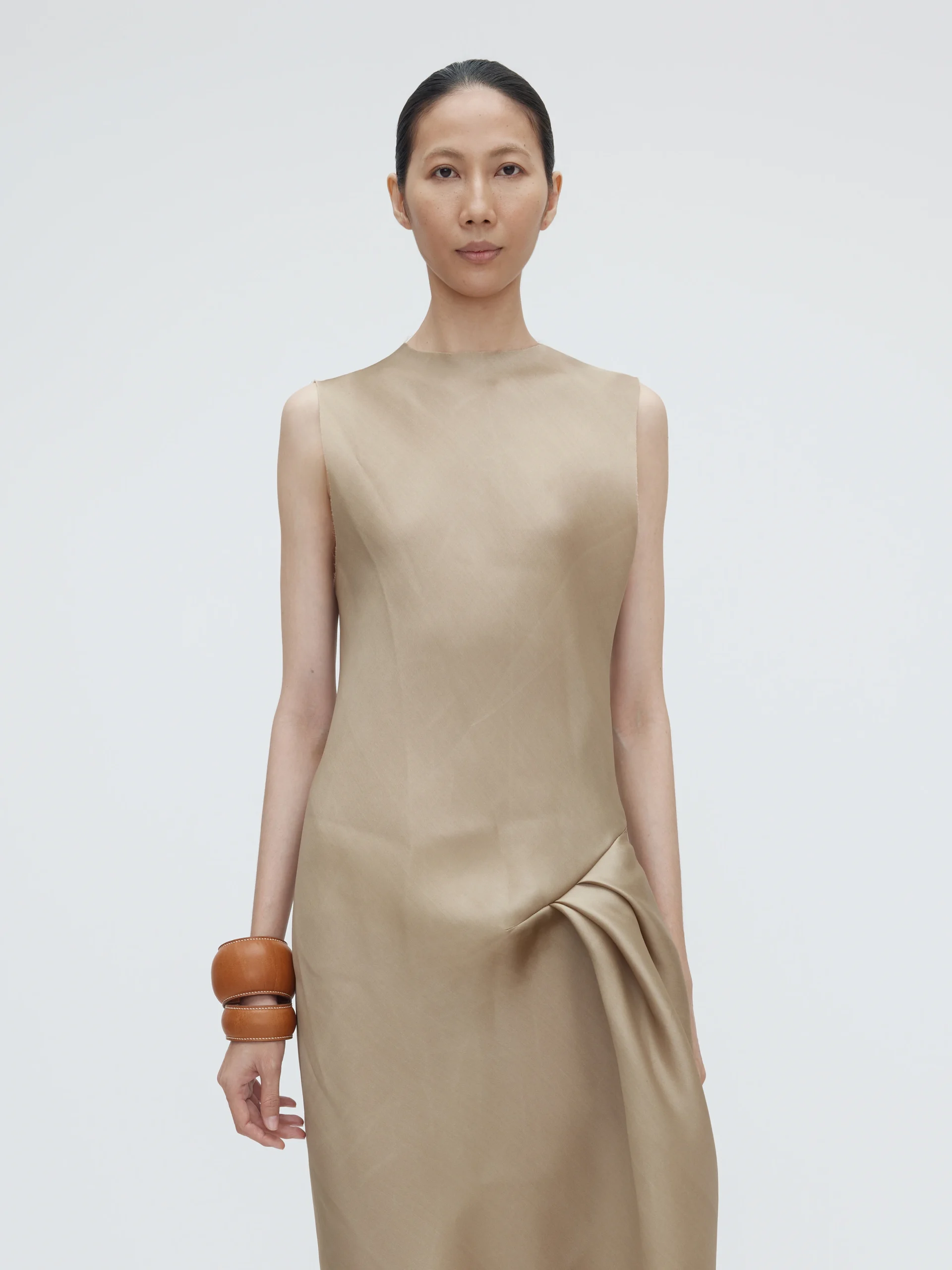 In softly glowing champagne Vietnamese silk, the ‘Gala’ dress features delicate pleats at the hips, shaping its A-line silhouette with gentle rhythm.
