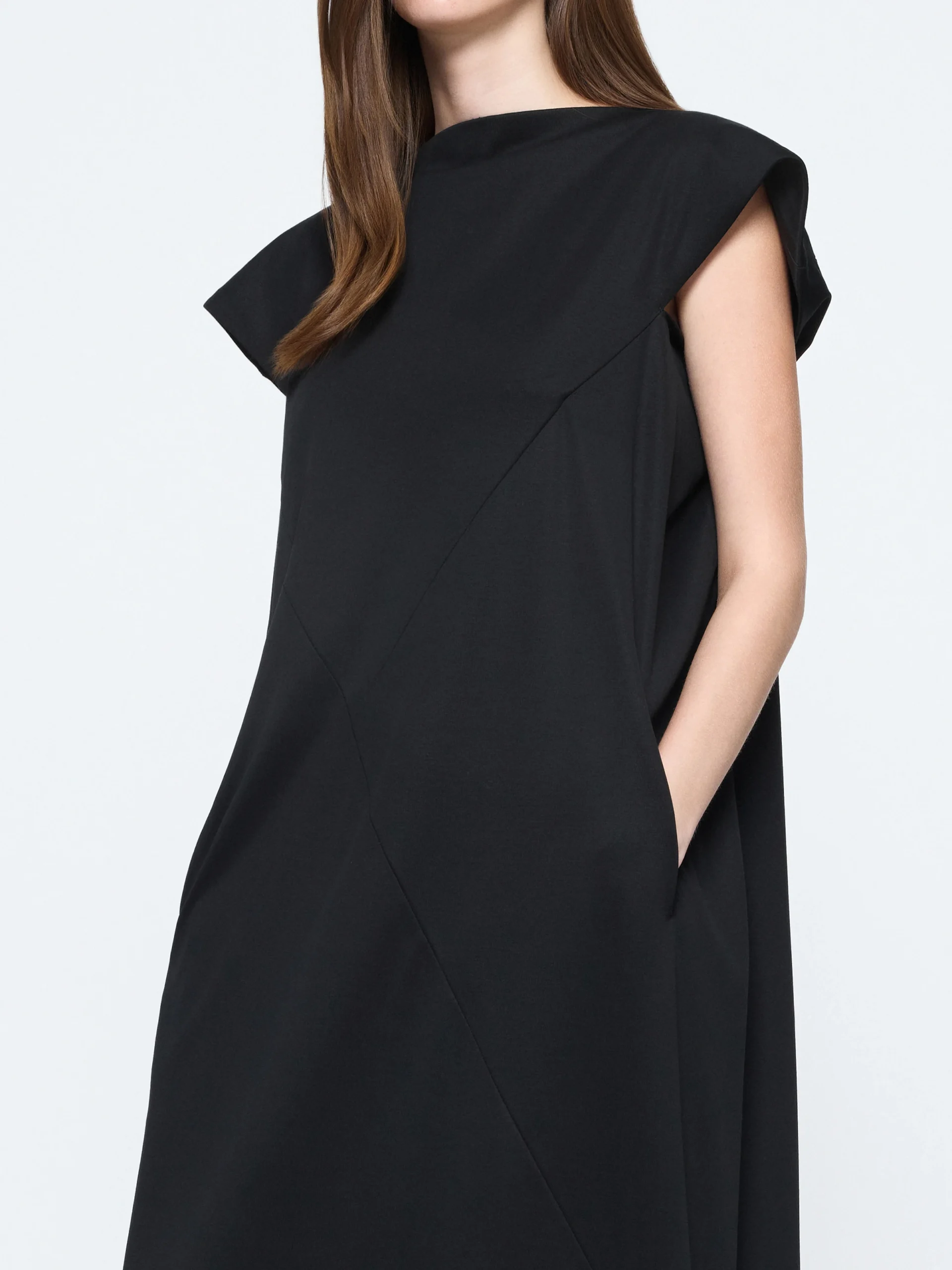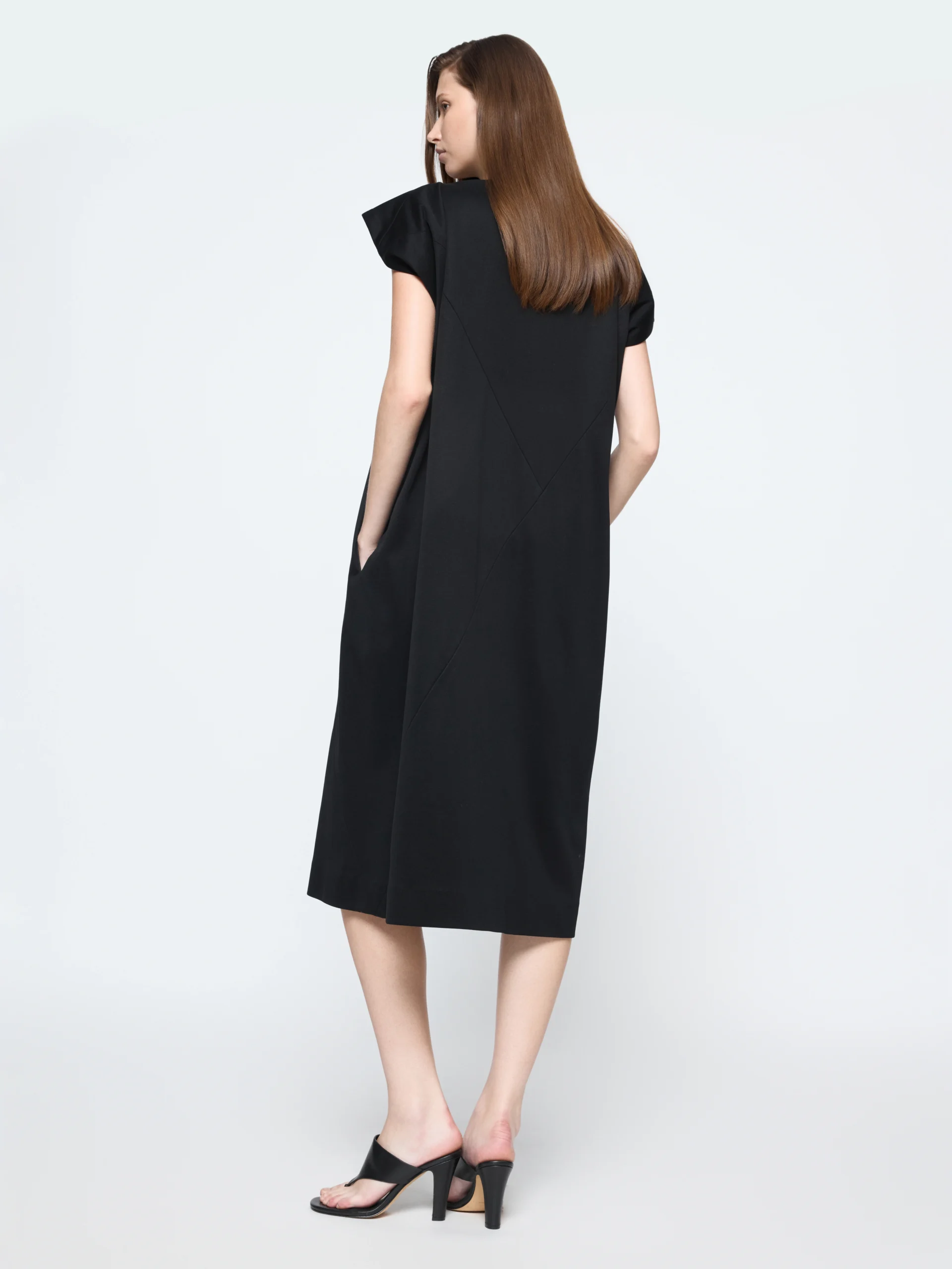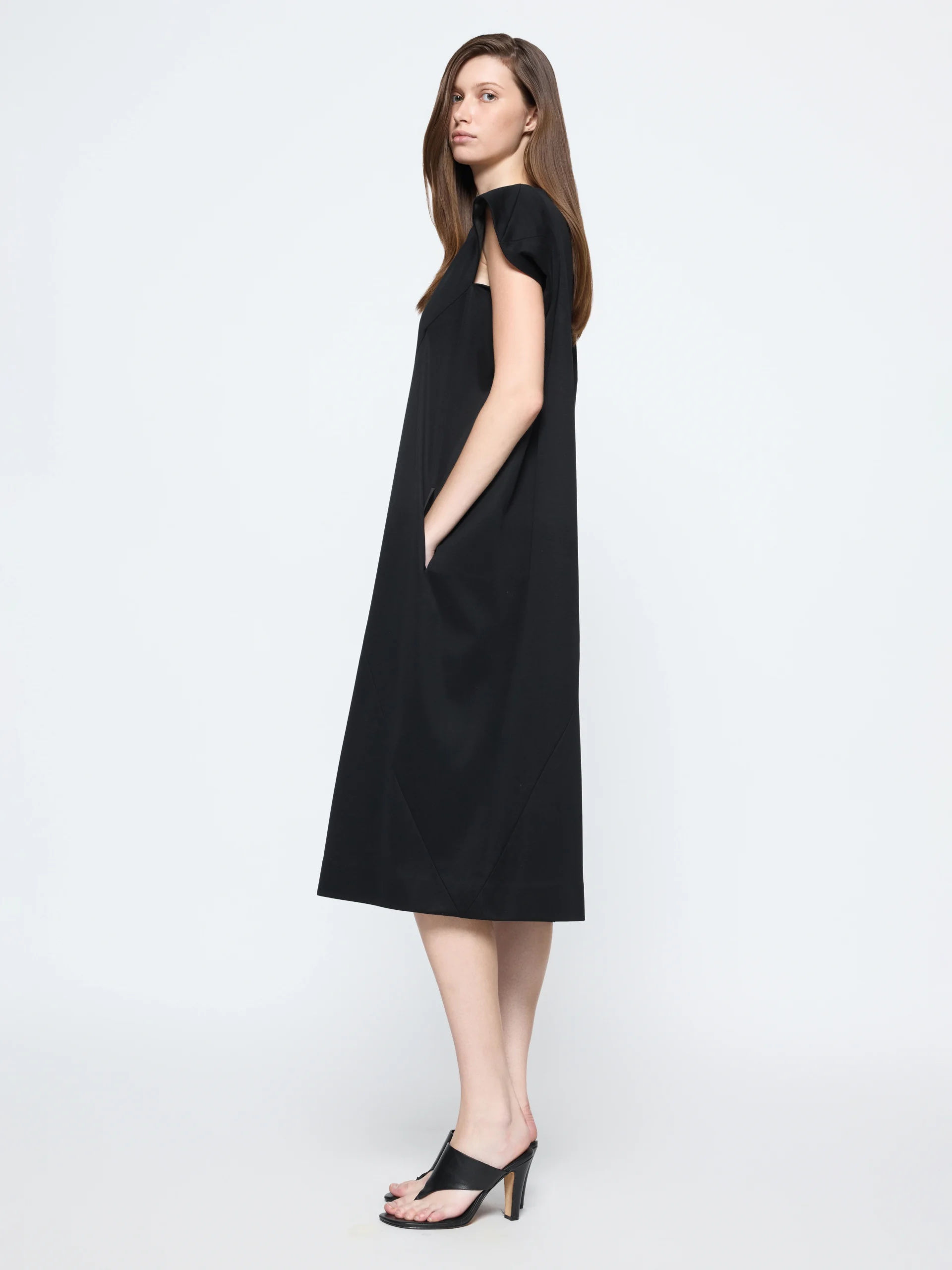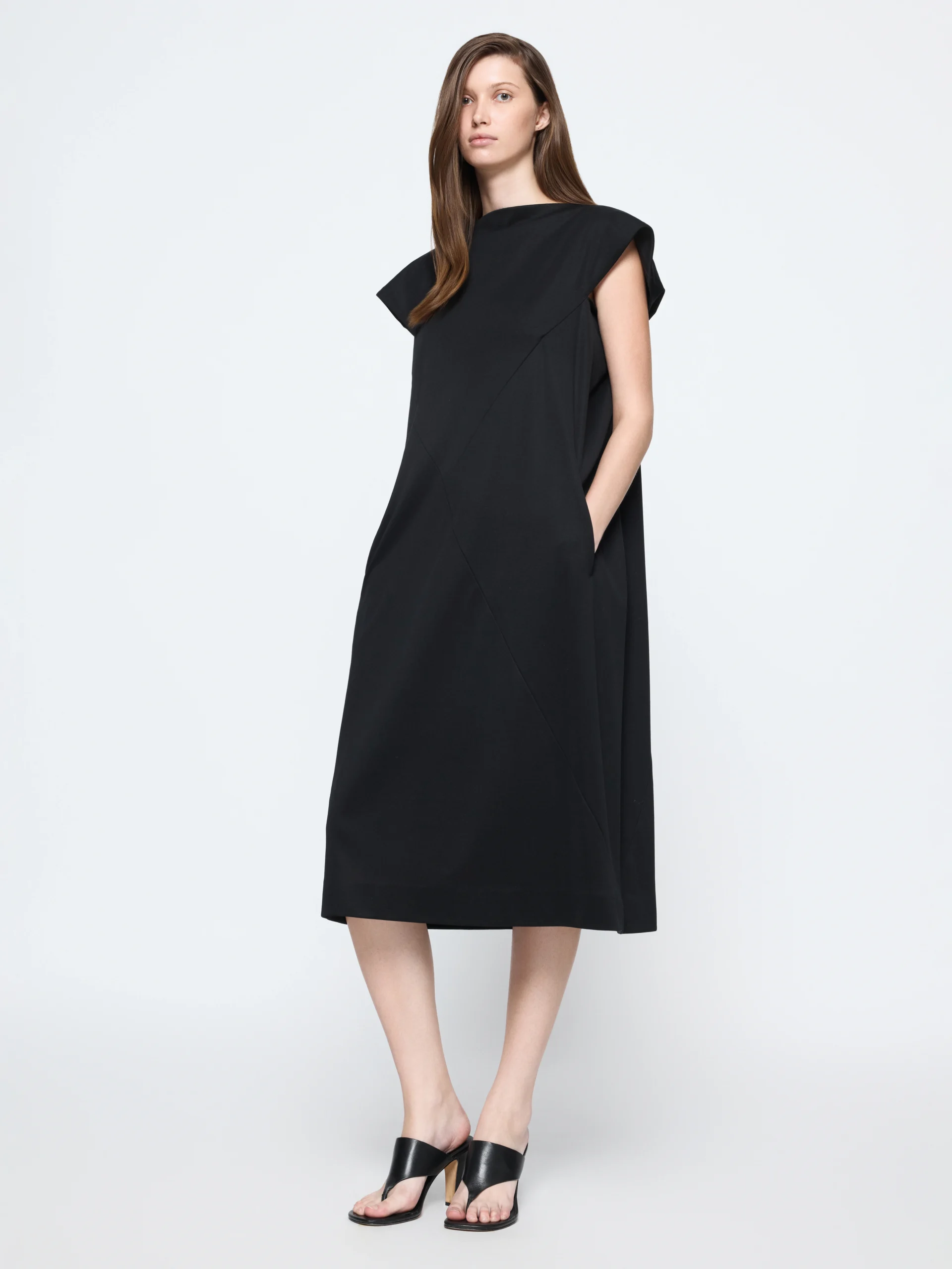 Shaped with dropped shoulders, a straight neckline, and side pockets set into satin panels, the “Hank” dress falls loosely to the calf. Echo the brand’s pared-back feel by styling it with leather flats or open sandals.
