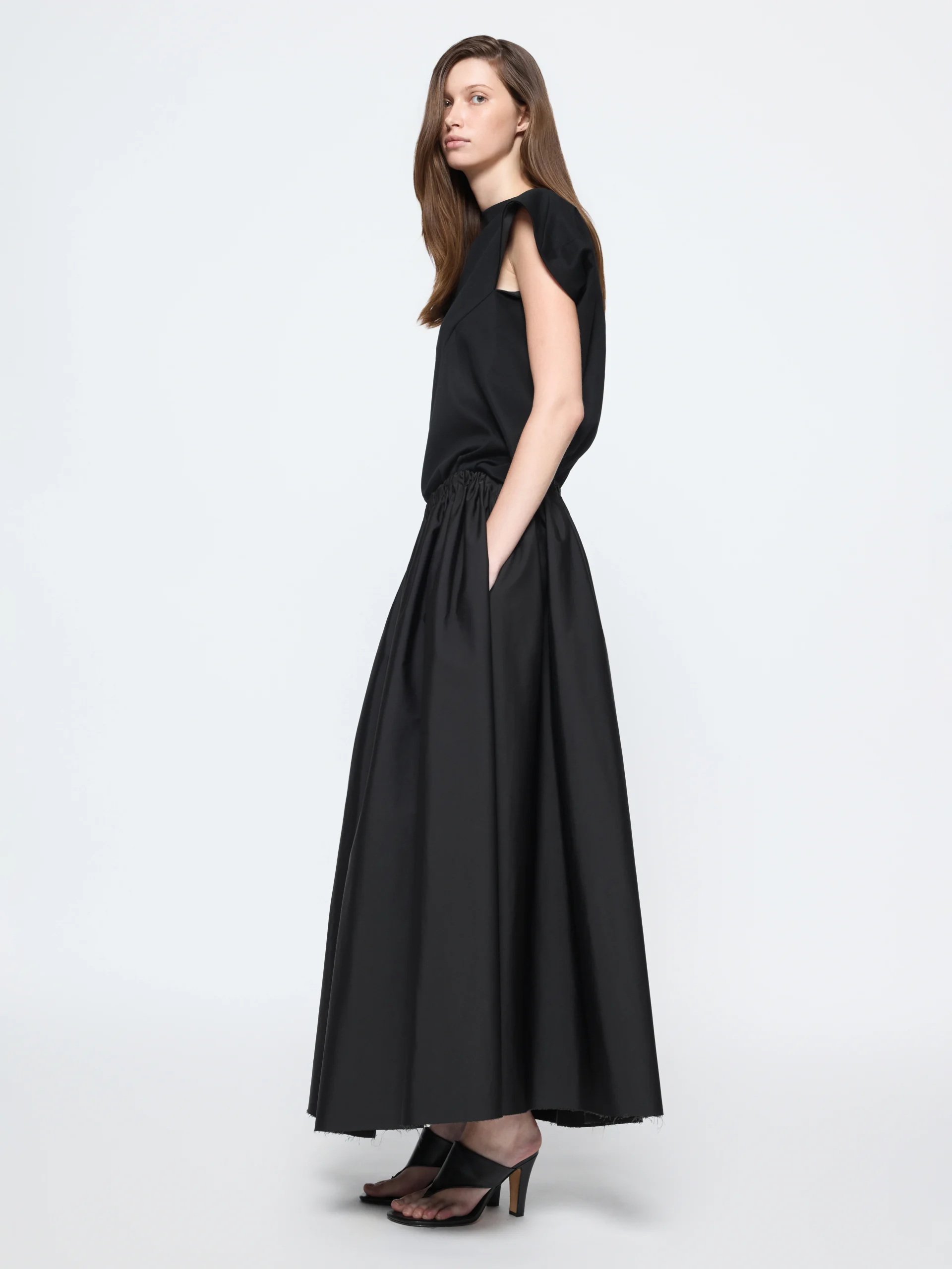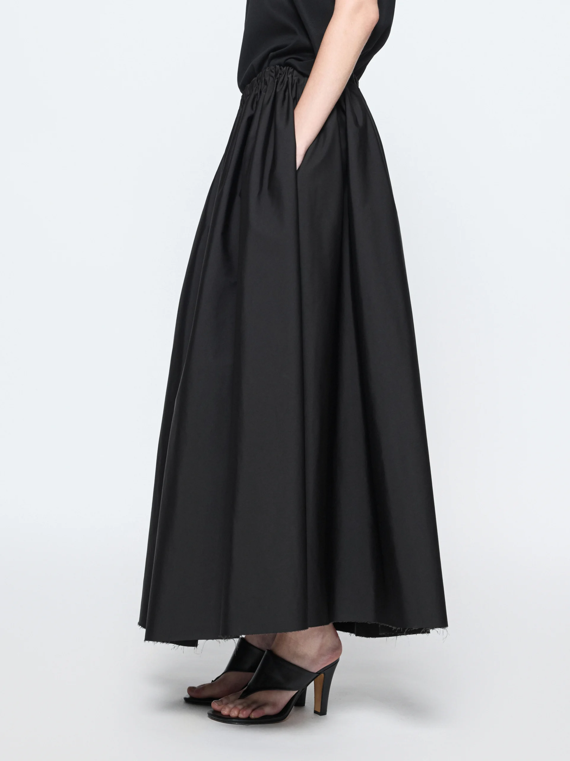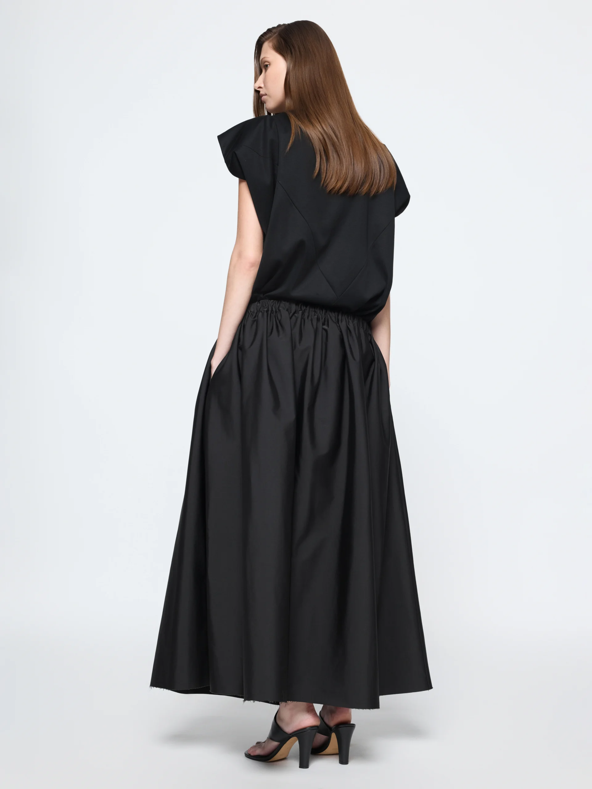 Shaped in black taffeta with an elastic waistband, the Gia Studios “Jules” skirt opens into a full flare at mid-calf. The surface carries a subtle sheen that responds to motion, giving the line a quiet rhythm as you walk.