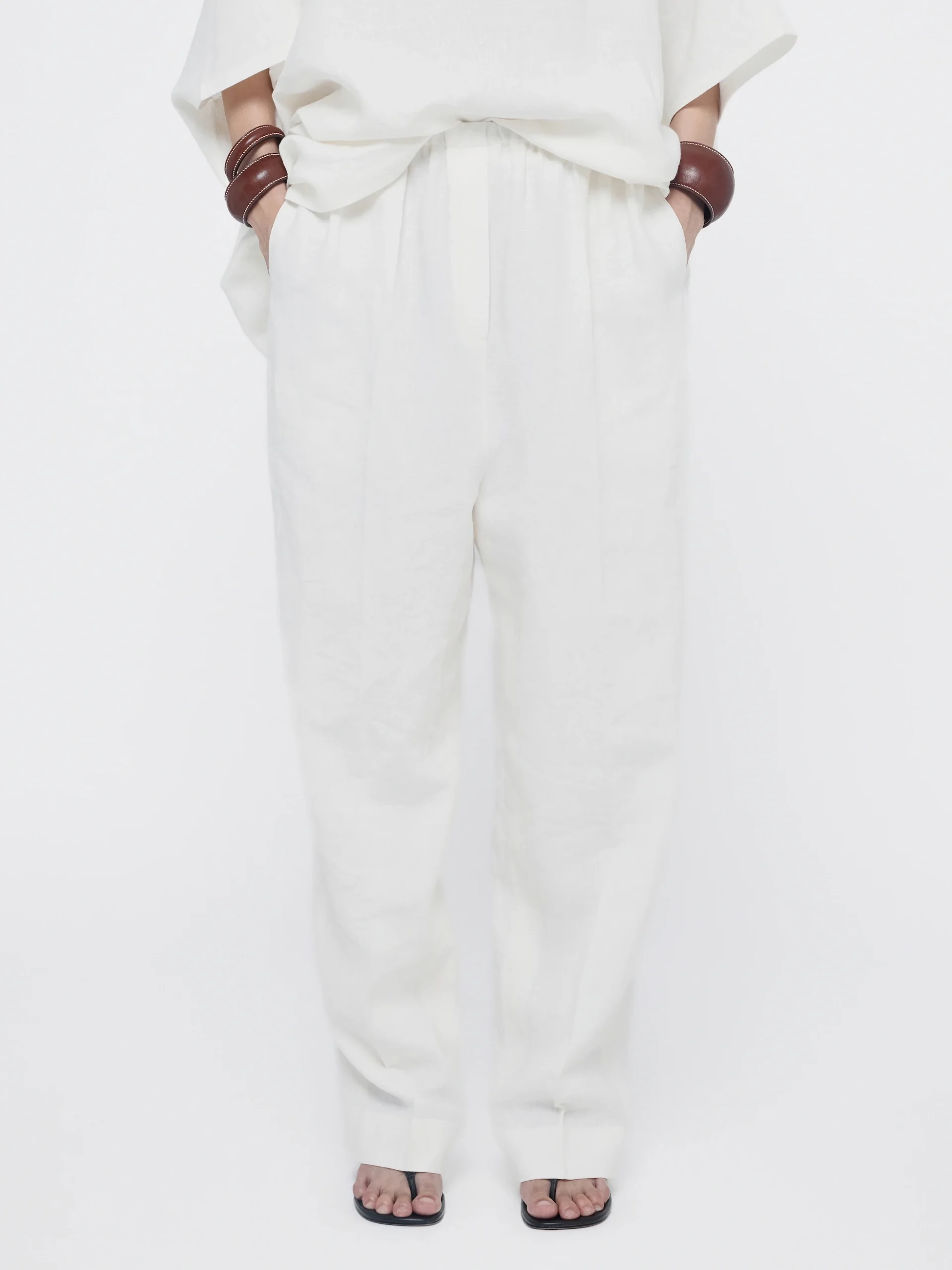 Front and back pleats shape a cocoon silhouette, linen and cupro keeping it light and airy. Available in white and black, it pairs seamlessly with any shirt or blouse.