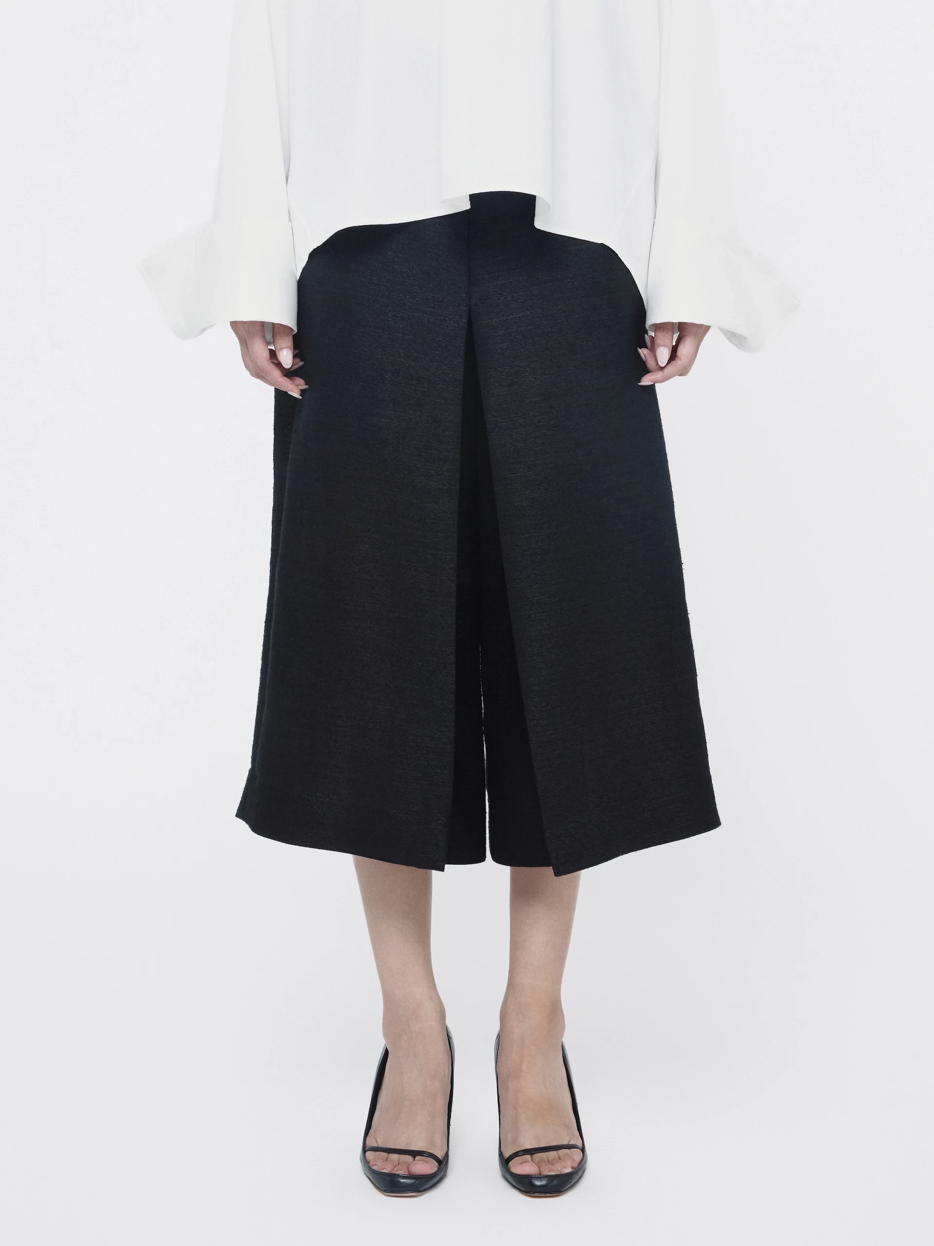 Slub silk combines linen’s texture with silk’s fluid drape. Luka bermuda shorts fall from a mid-rise waist into relaxed legs that shift lightly with every step.