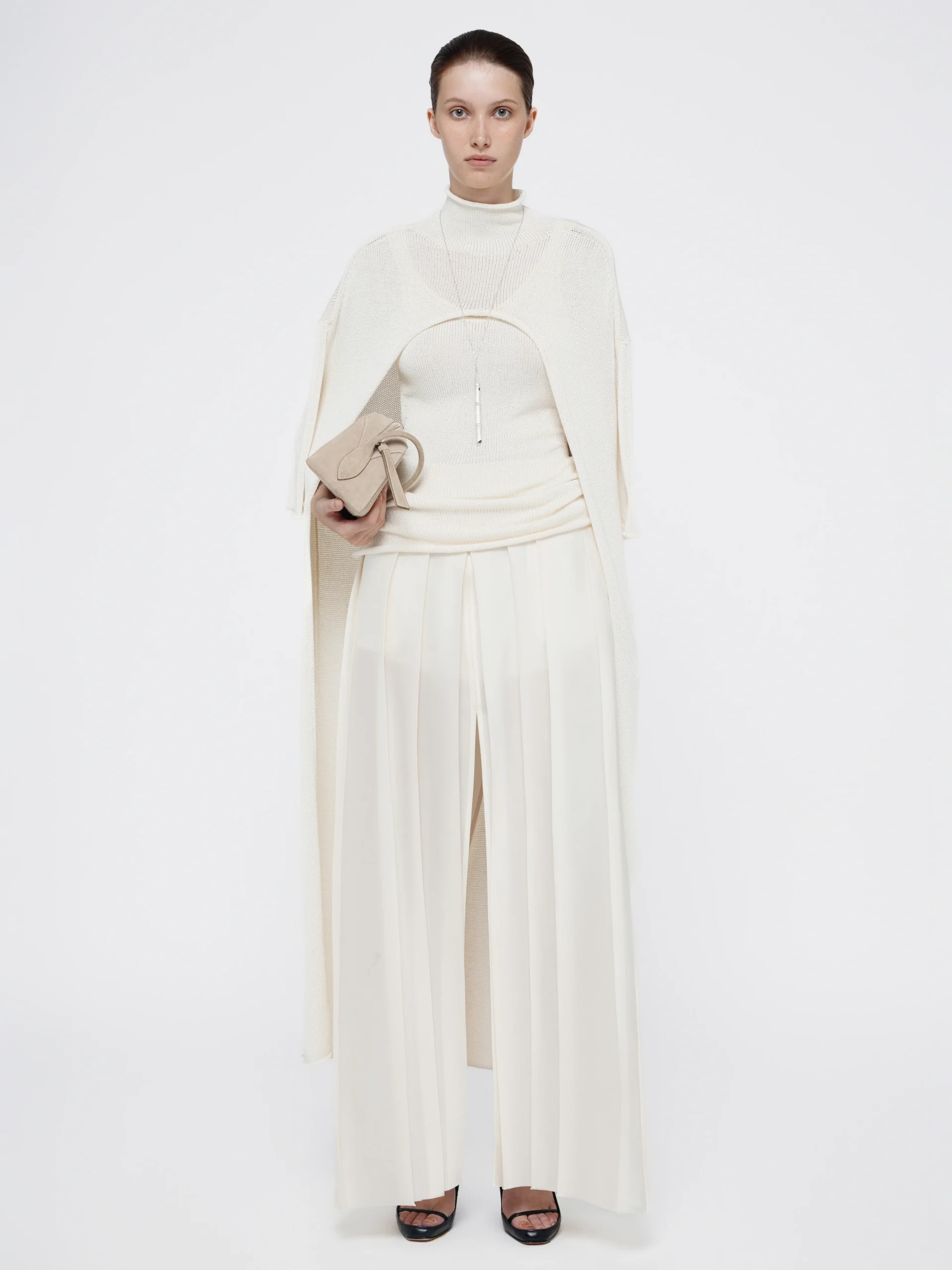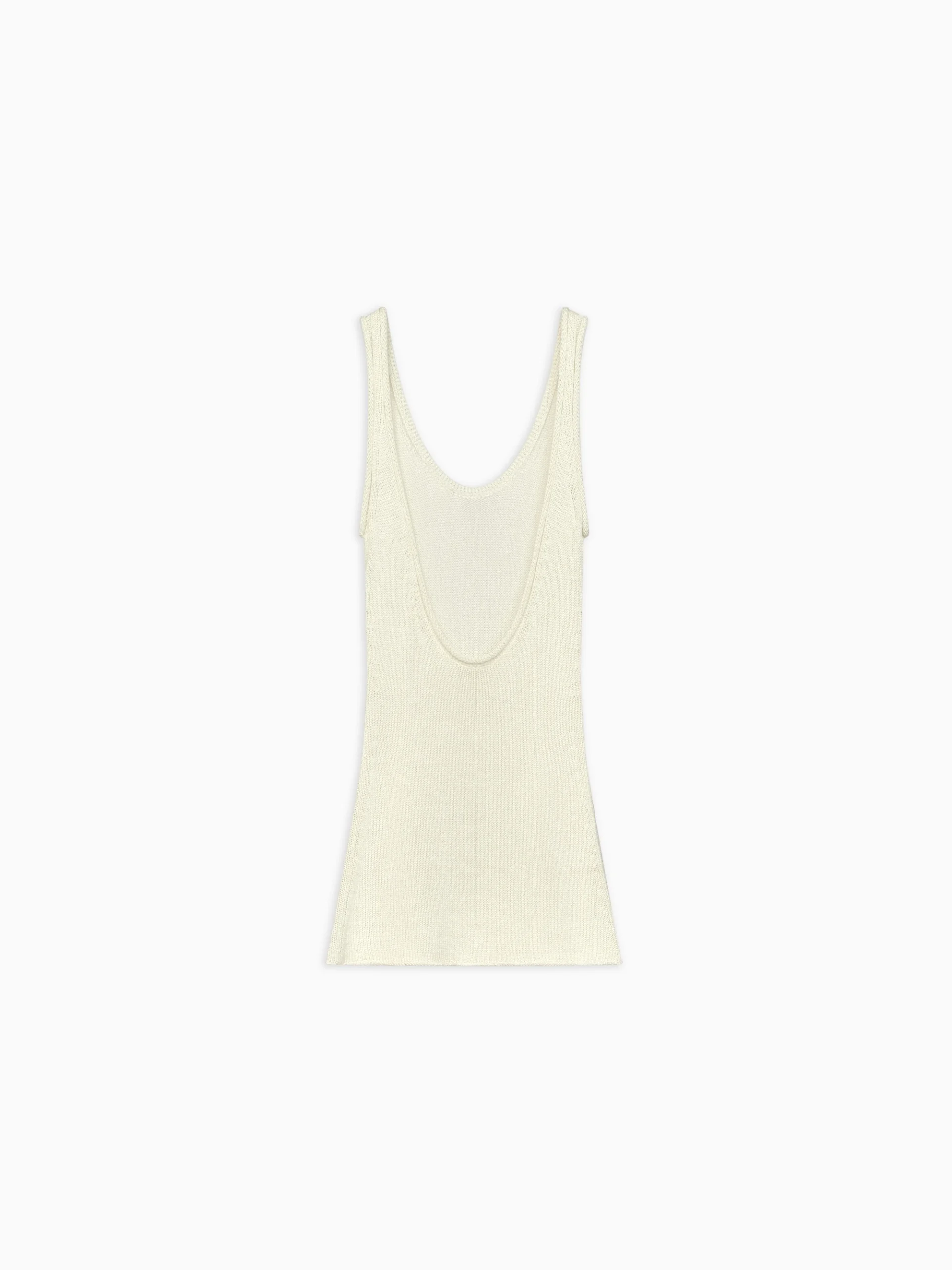The Nicole Tank Top in knitted silk, gently contours the body with a fitted silhouette. A low neckline opens to a deep back, inviting effortless styling with trousers or skirts.