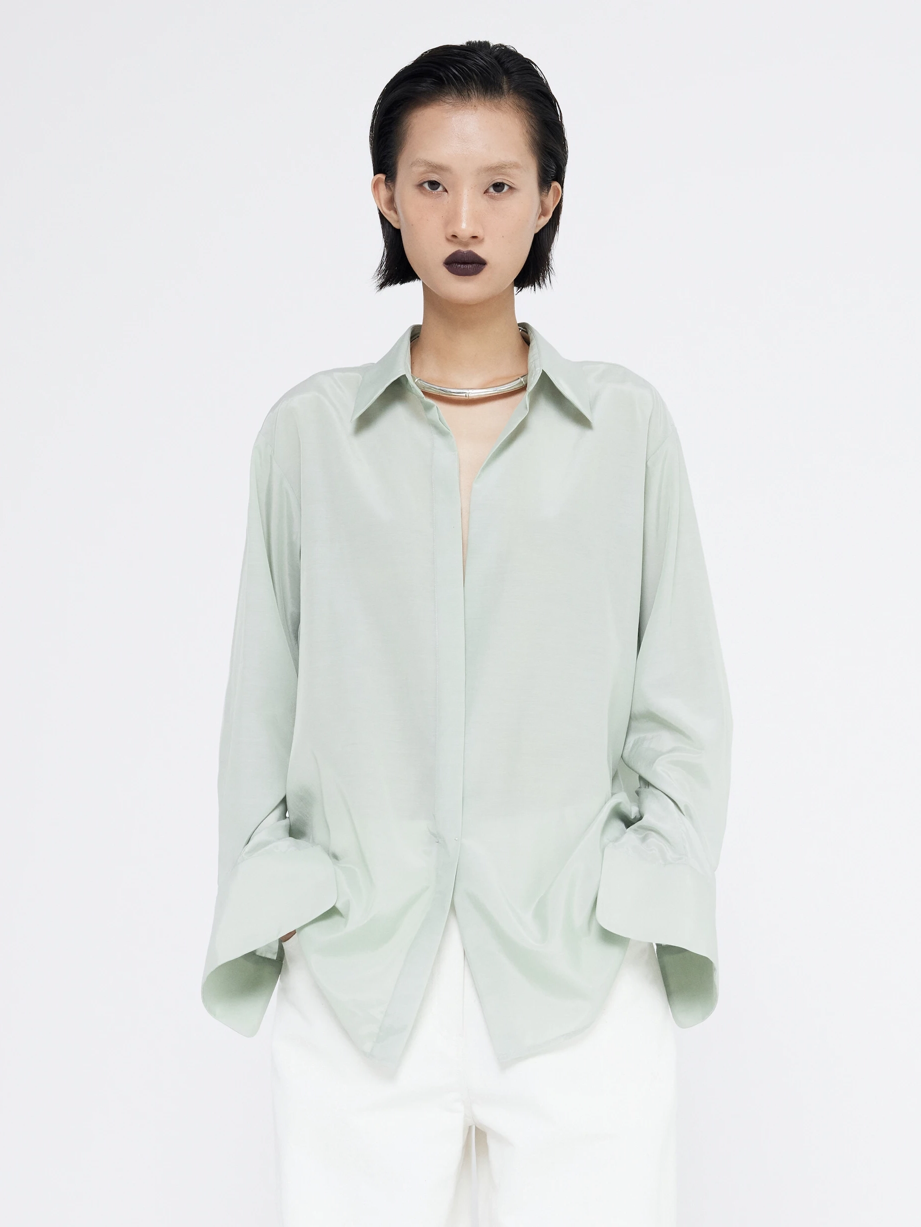 A bamboo silk blend gives the Oliver shirt a soft, fluid drape through its relaxed shoulders and long sleeves. Left loose or half-tucked, it pairs naturally with black or white trousers in the understated spirit of Gia Studios.