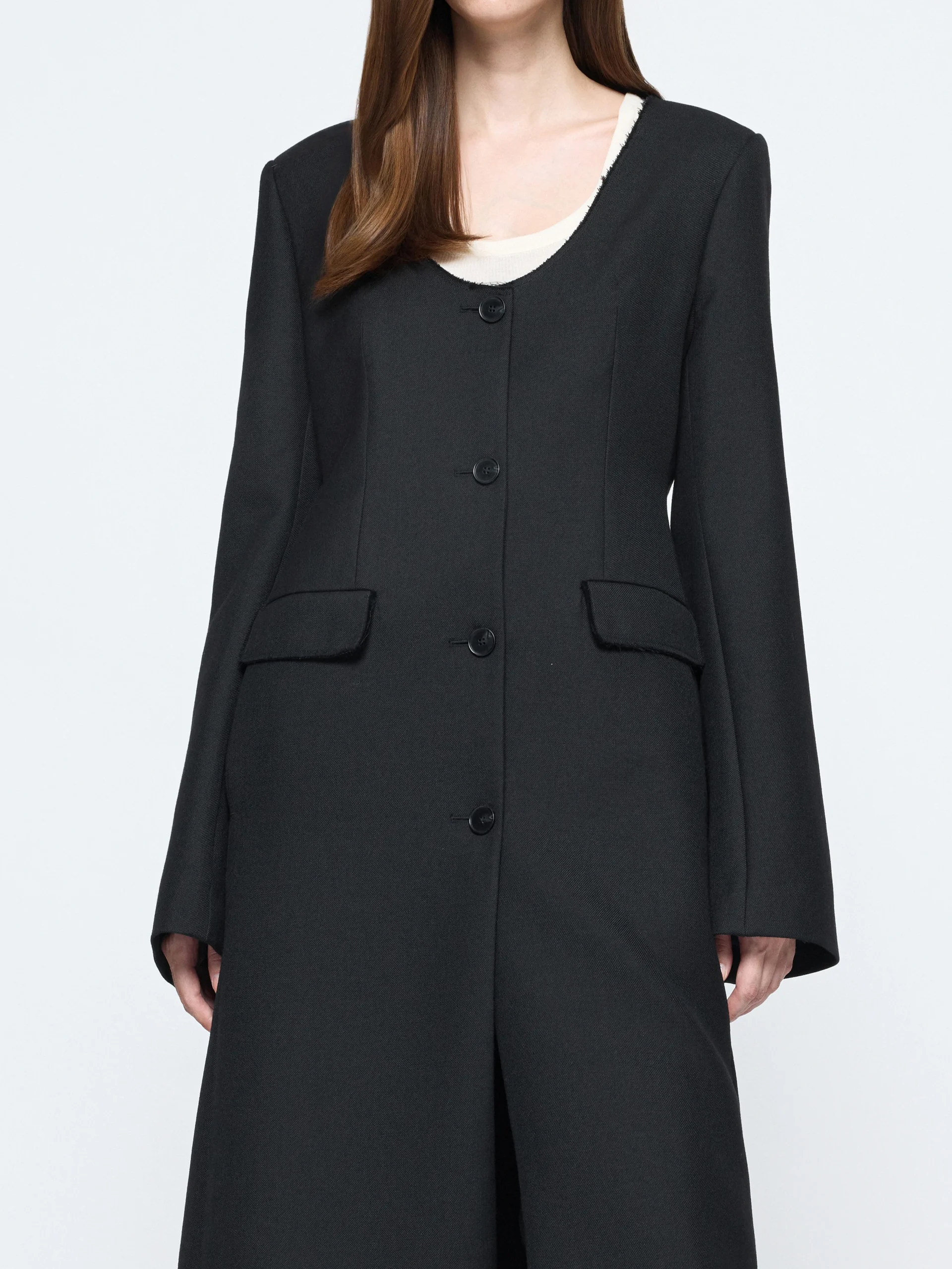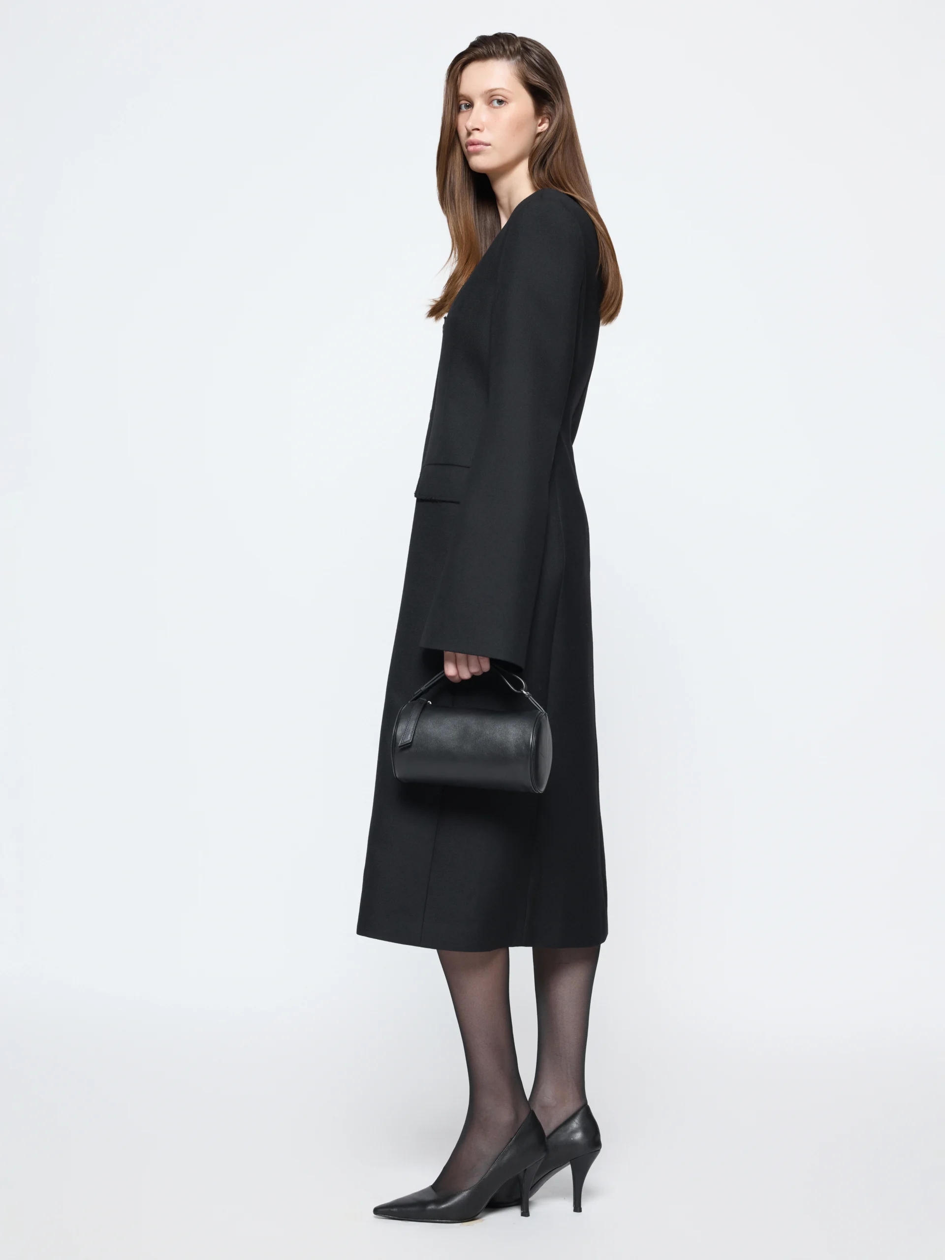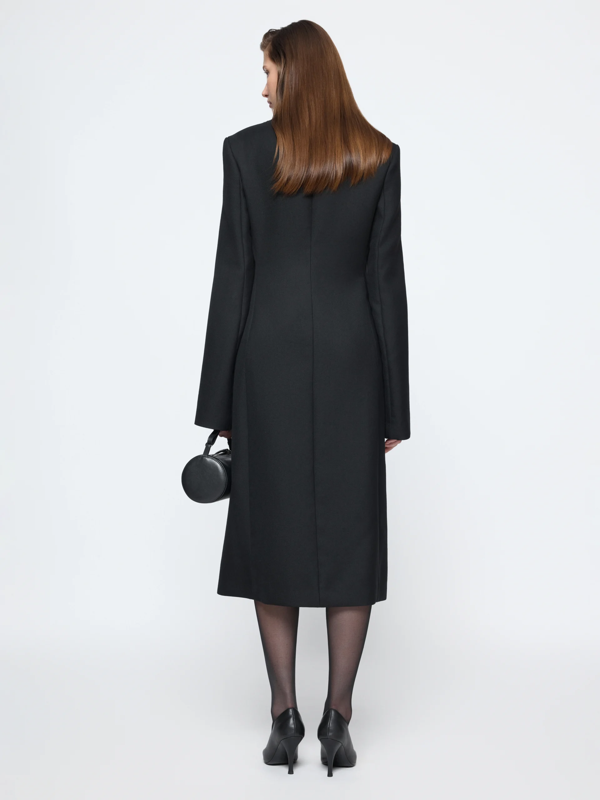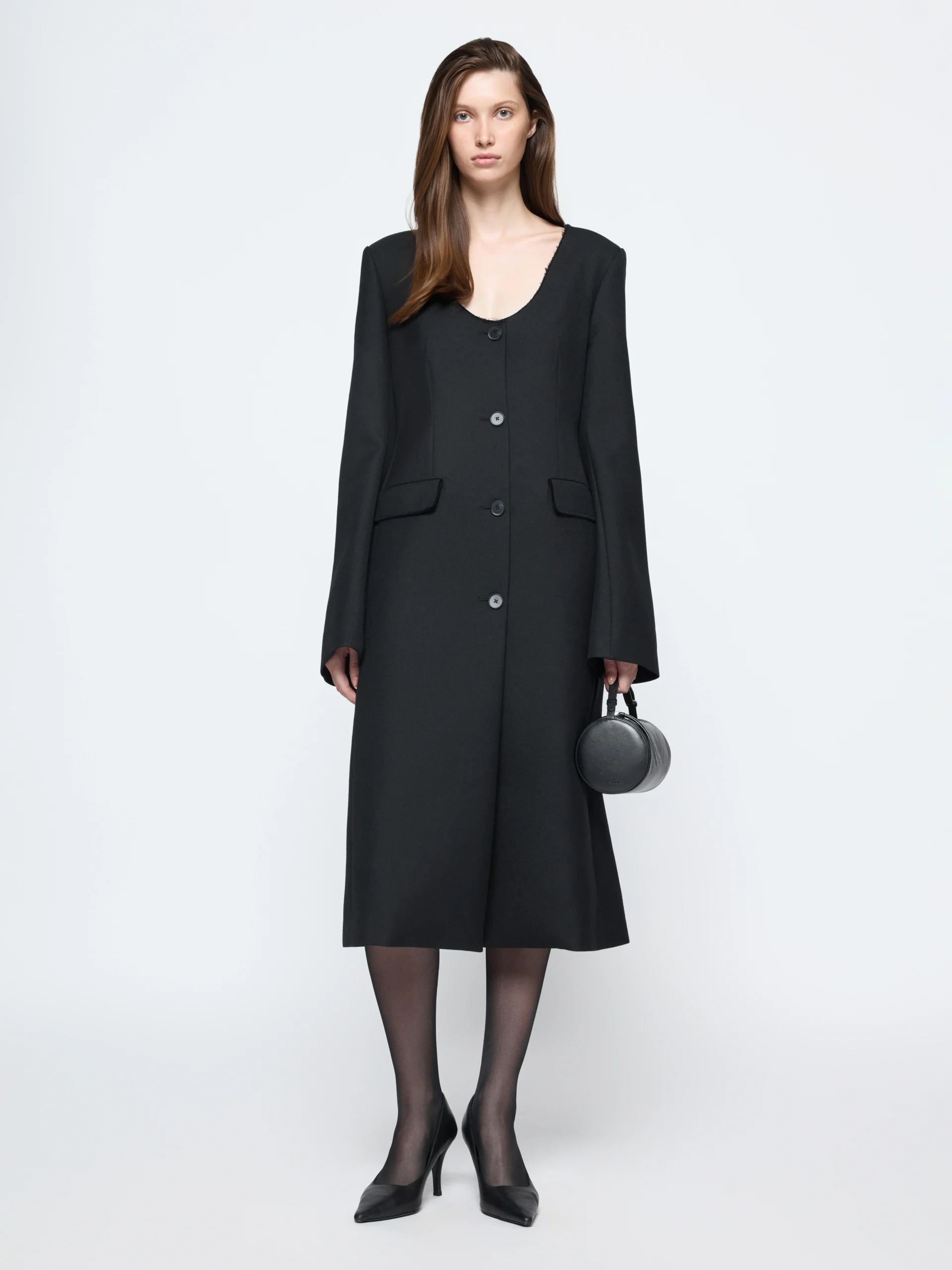 A fitted body, deep U neckline, and flared sleeves form the Opal coat’s frame. Crafted in wool with raw-edged details, it stays precise in both cut and longevity.