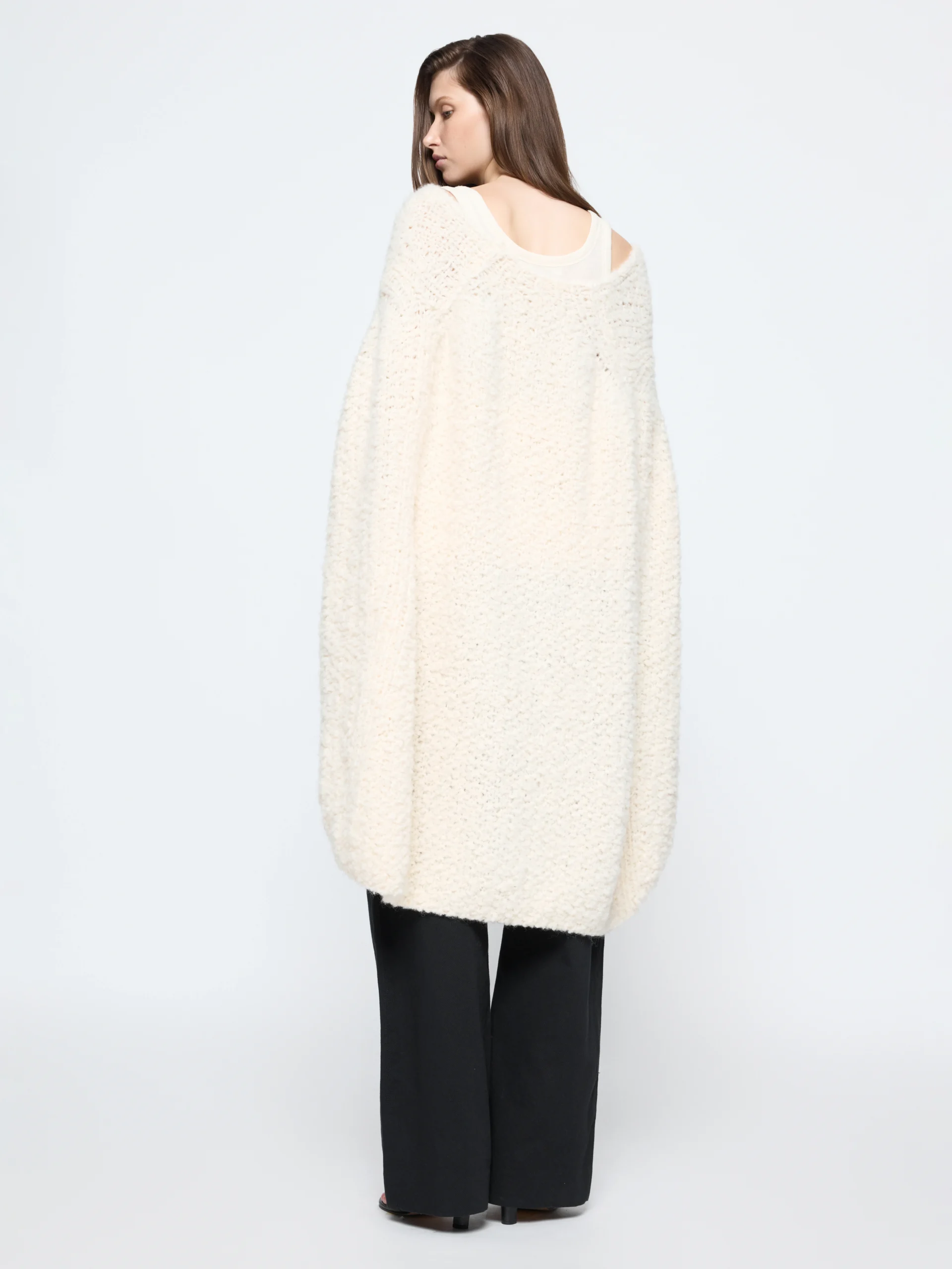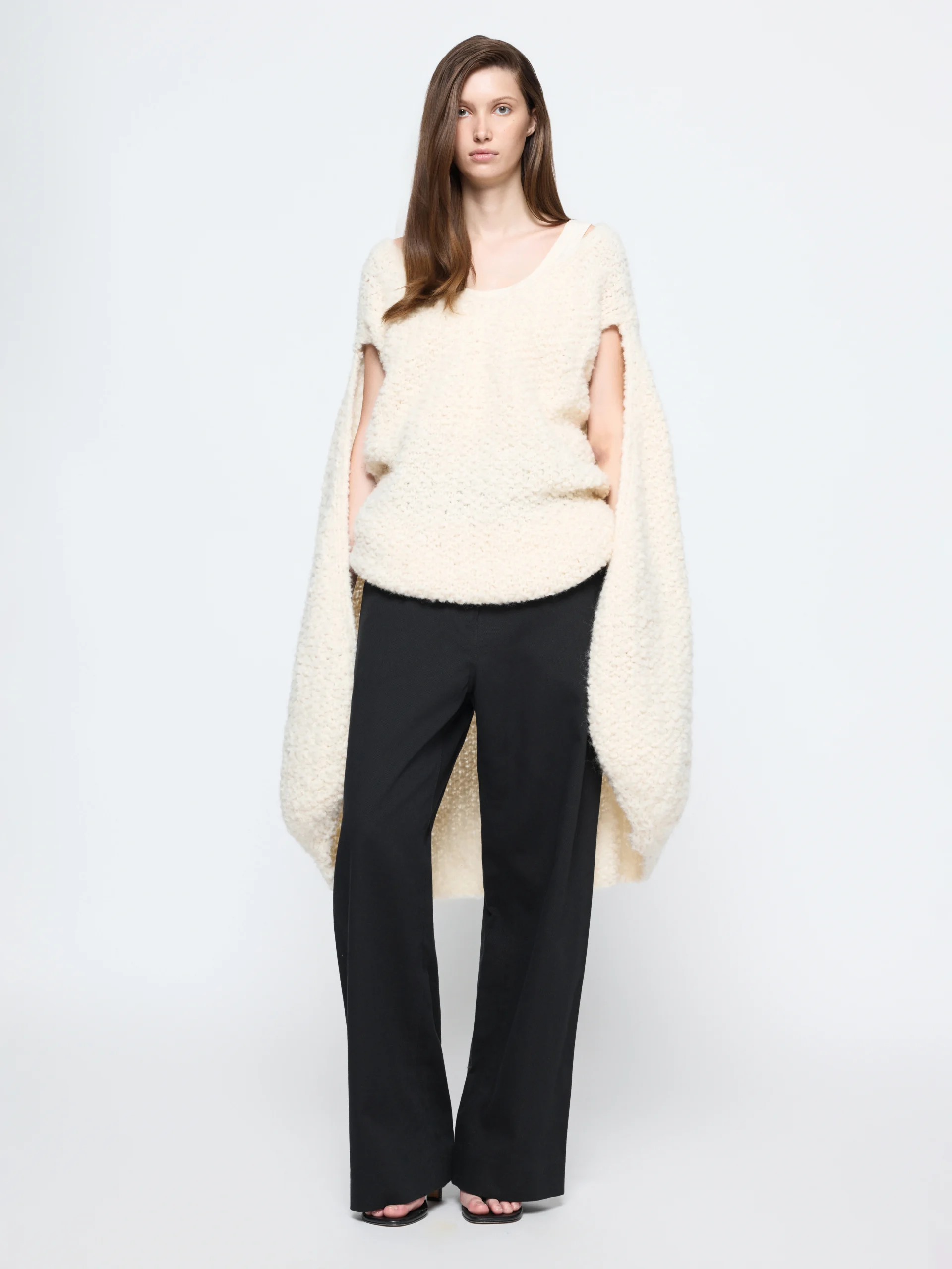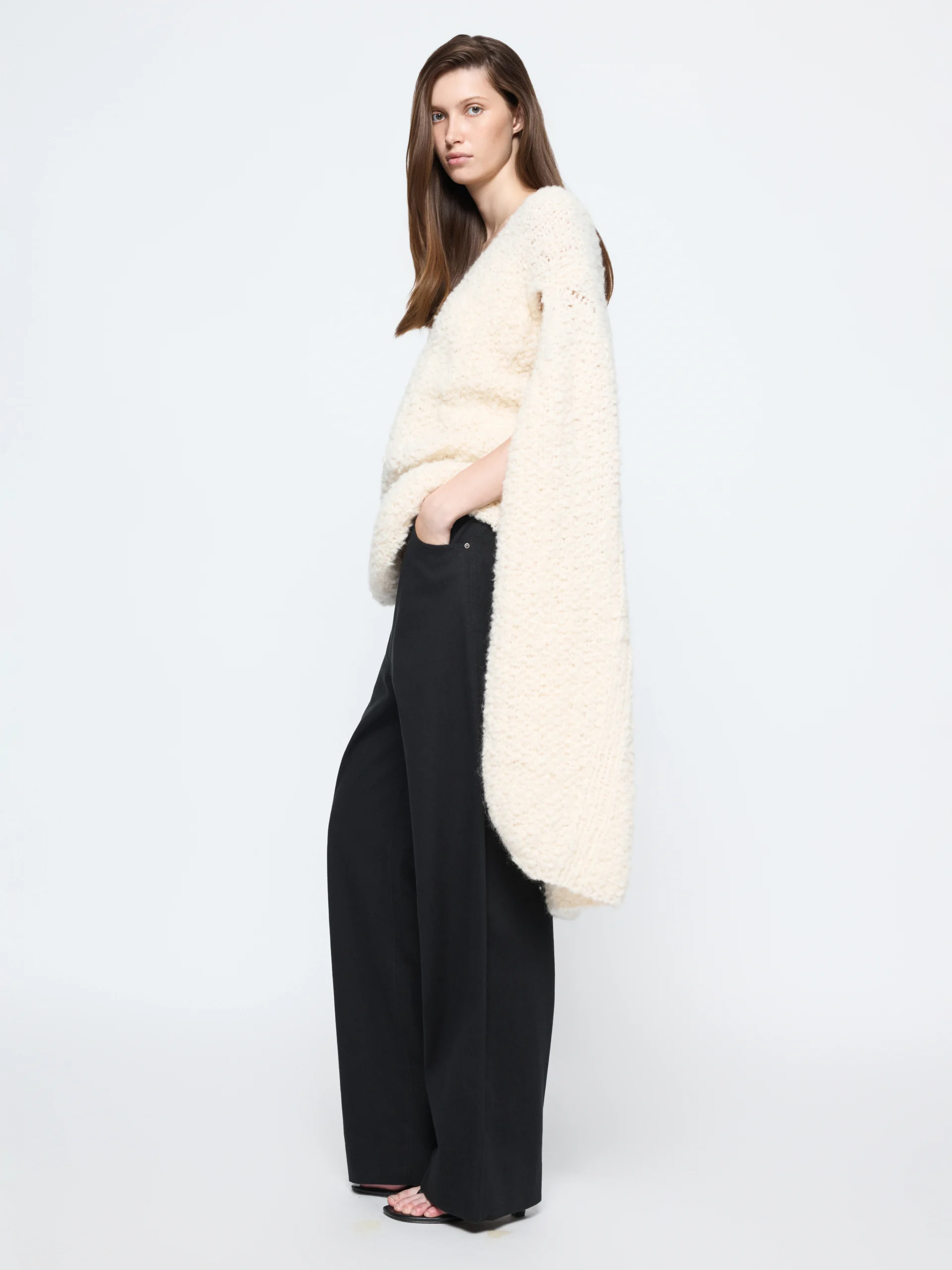Black cotton–linen denim gives the “Raven” trousers a structured weight that relaxes through the hips. The cocoon shape falls long to the floor, best styled with crisp shirting or soft jersey layers.