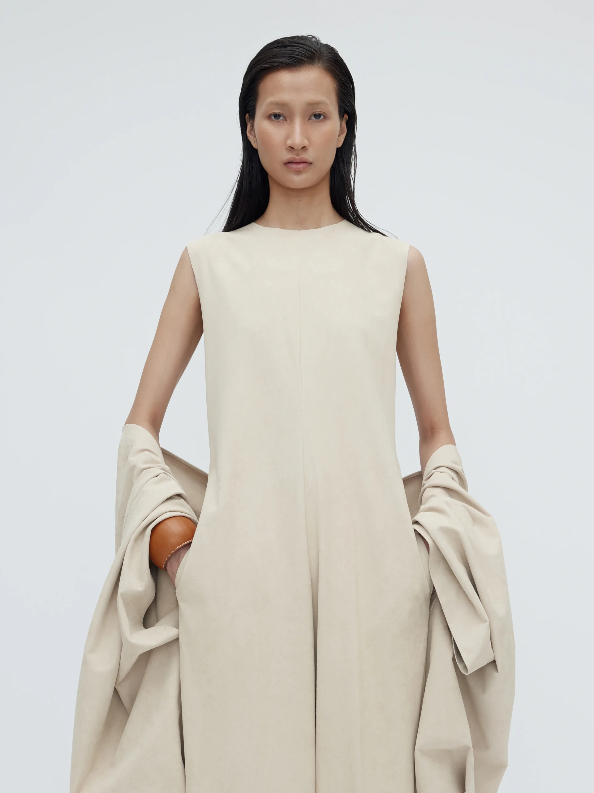 The ‘Rocco’ jumpsuit in off-white micro suede features clean lines, deep armholes, and a slim waist belt, elevated by its smooth, velvety texture.