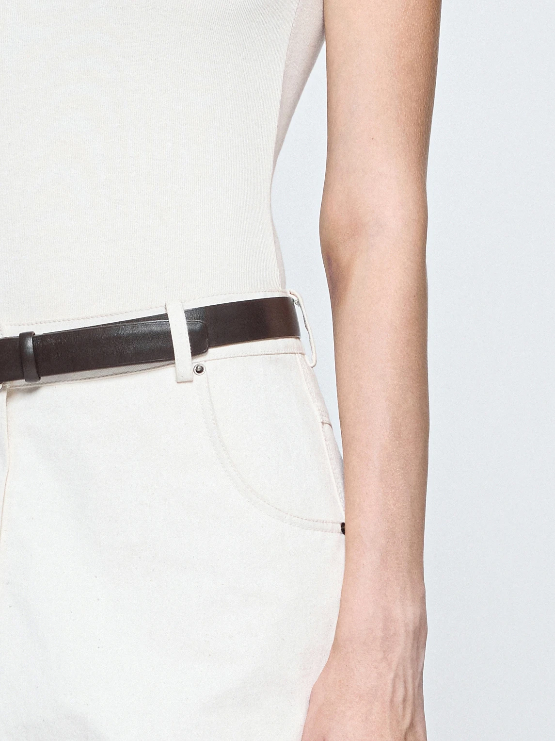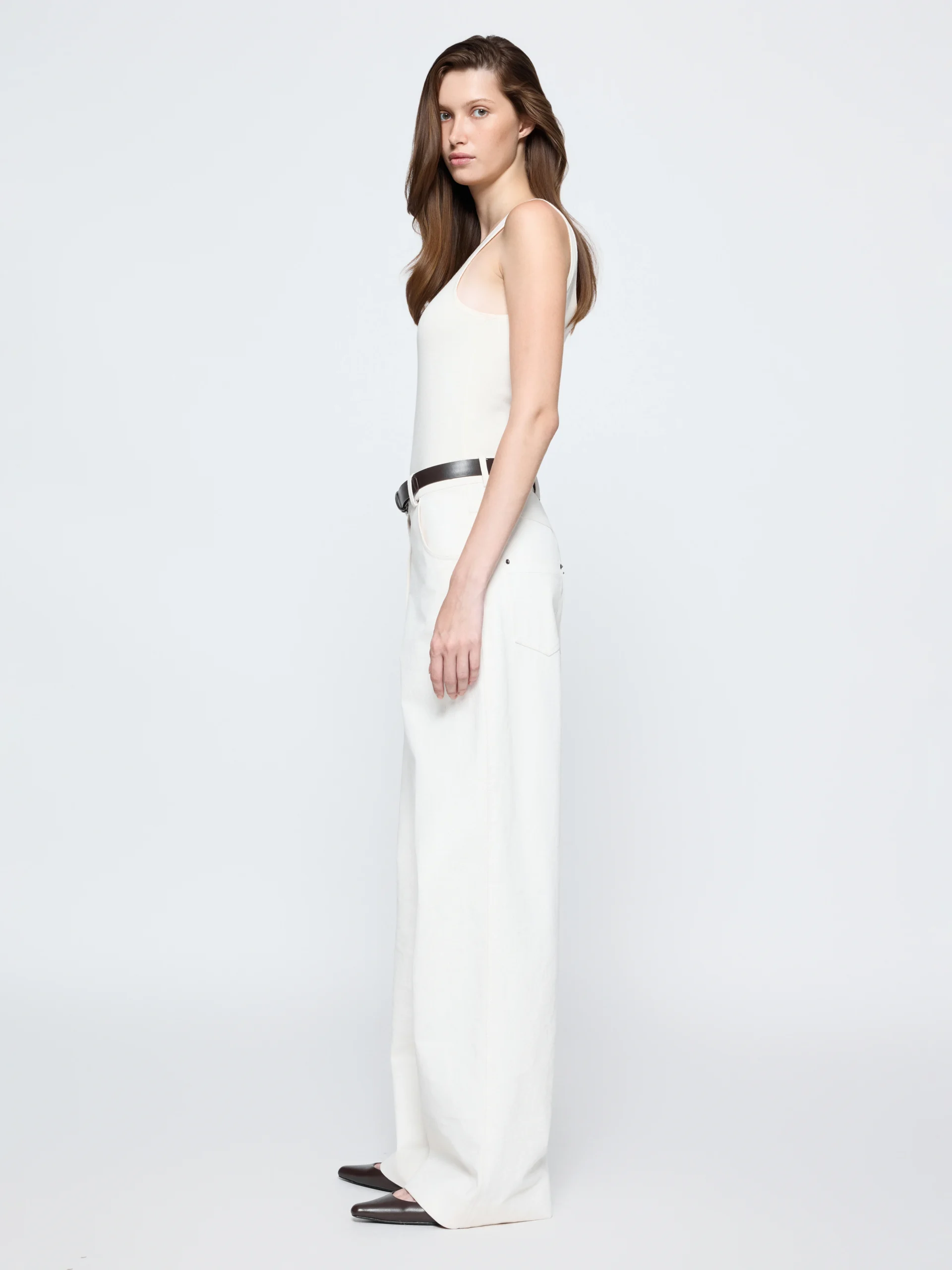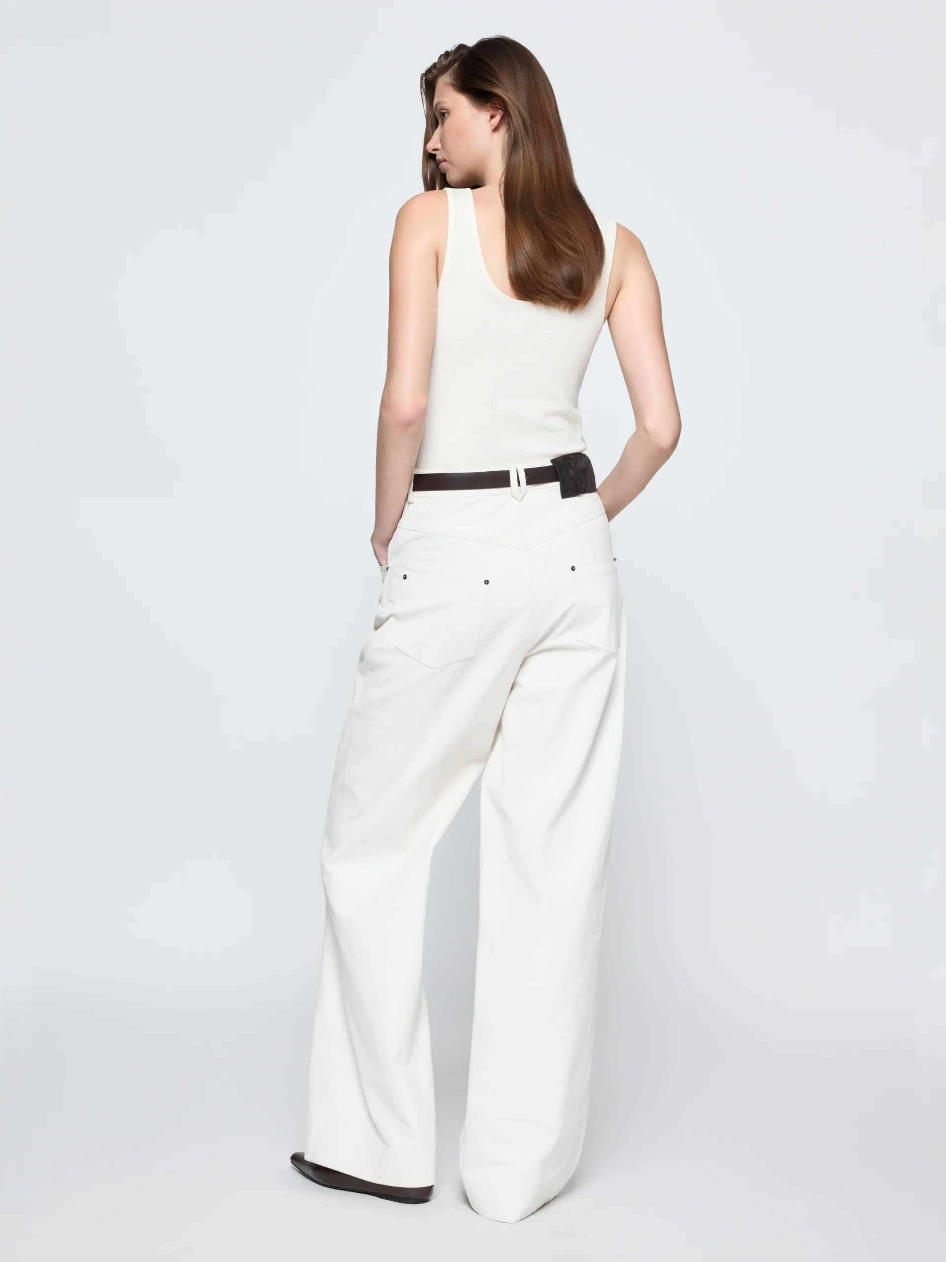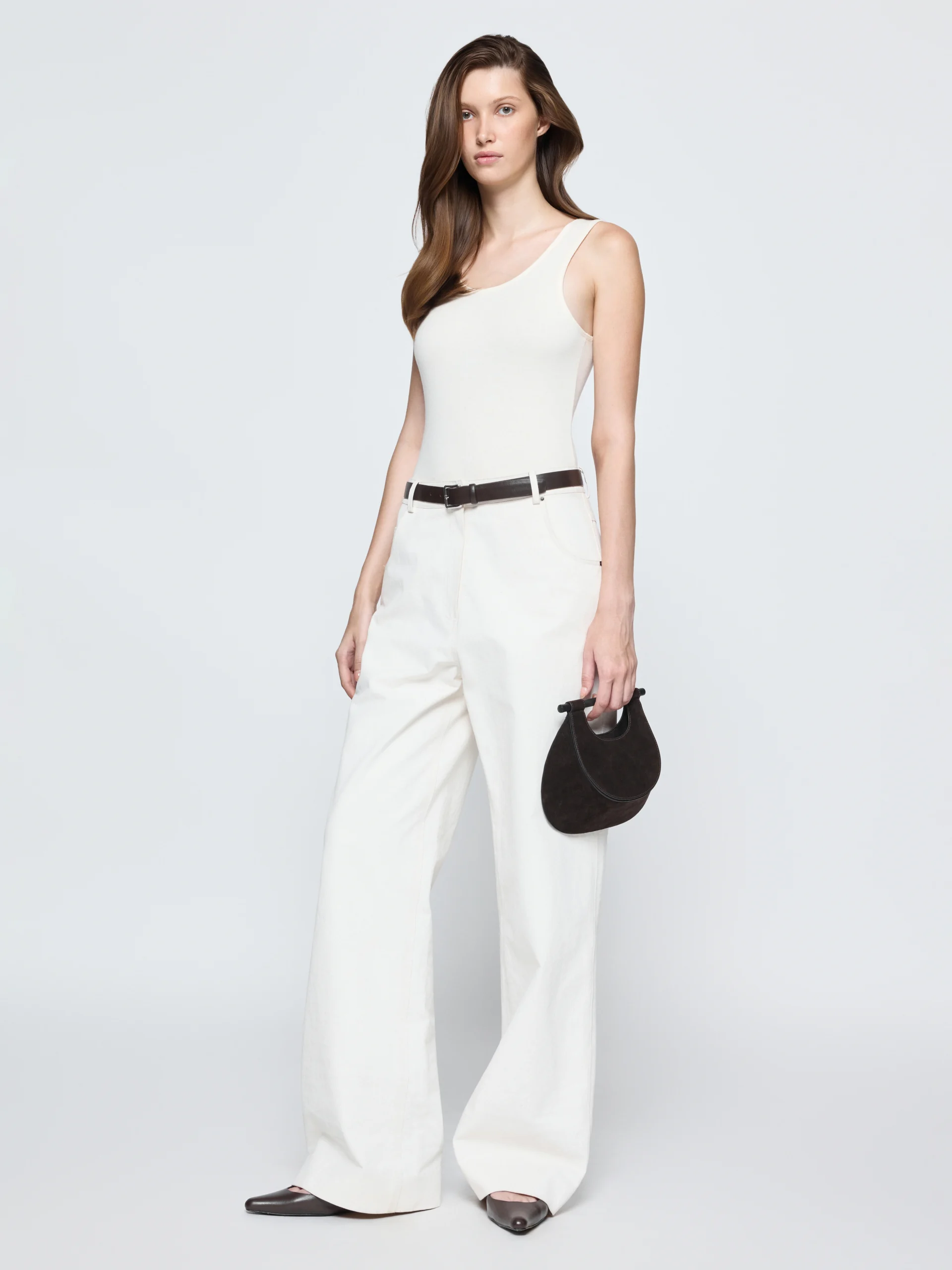 Cut from off-white cotton, the “Rowan” trousers sit low on the waist and fall straight to the floor. The slouch in the rise softens the line, leaving space for movement while keeping the fabric close to the body.