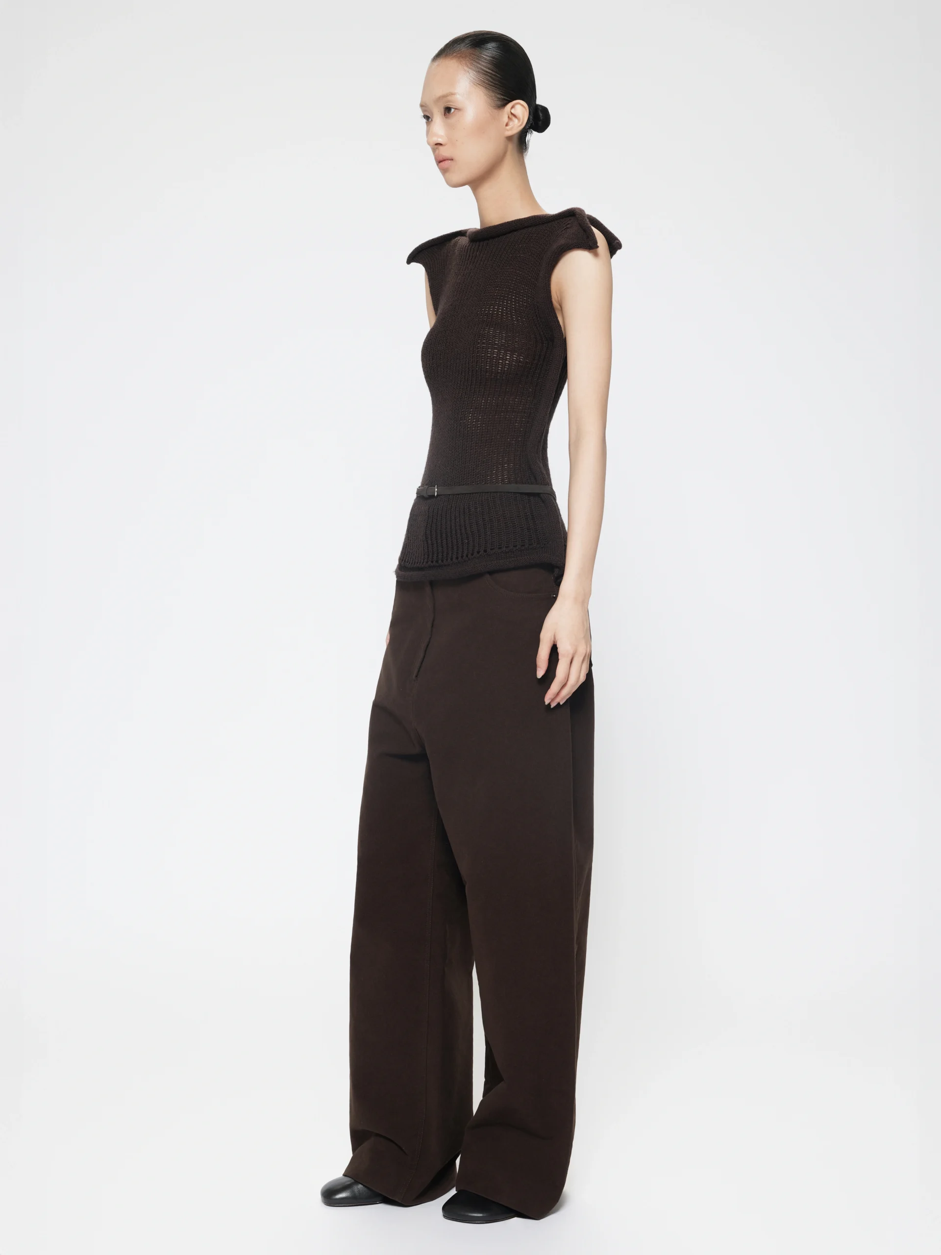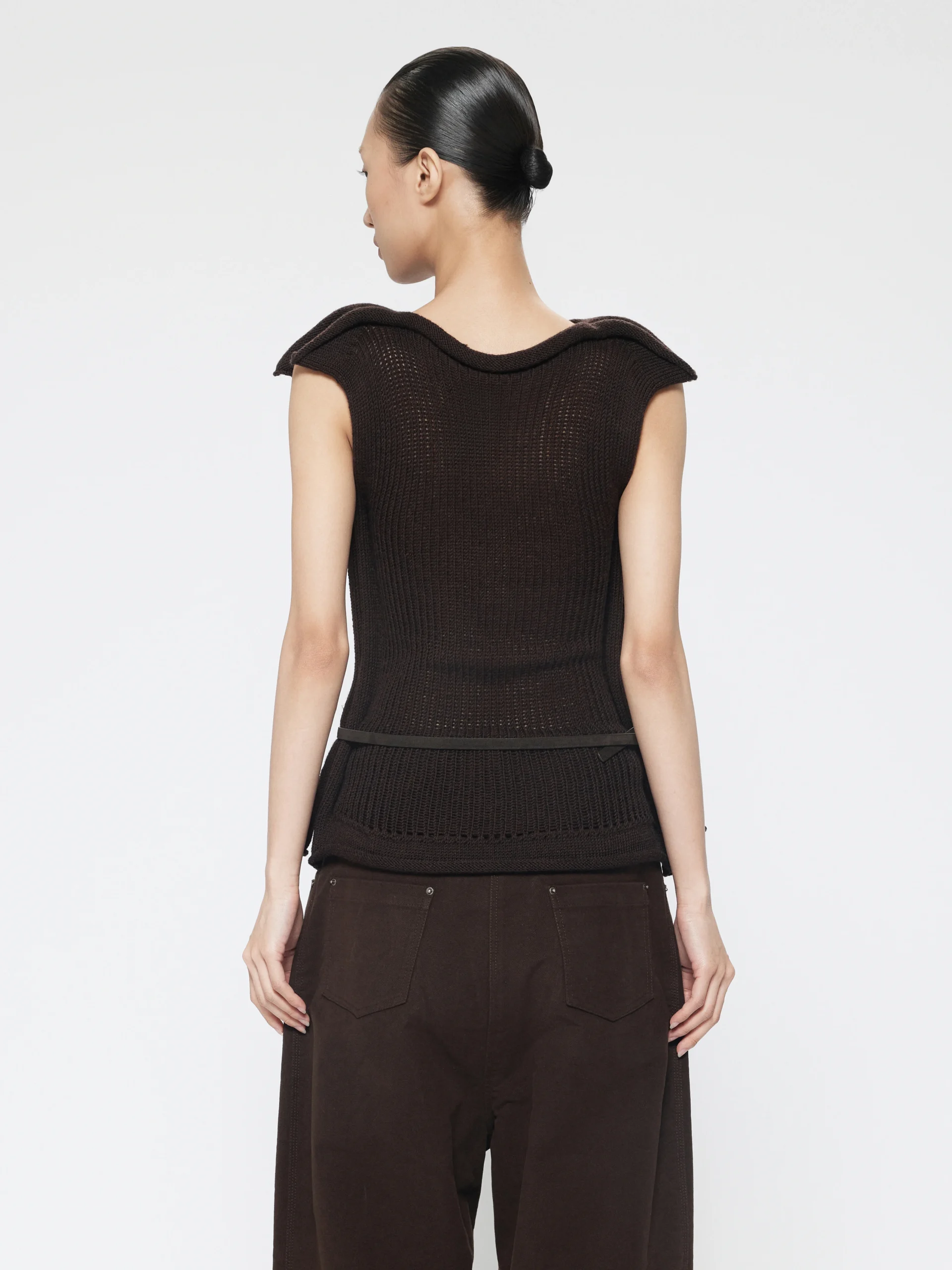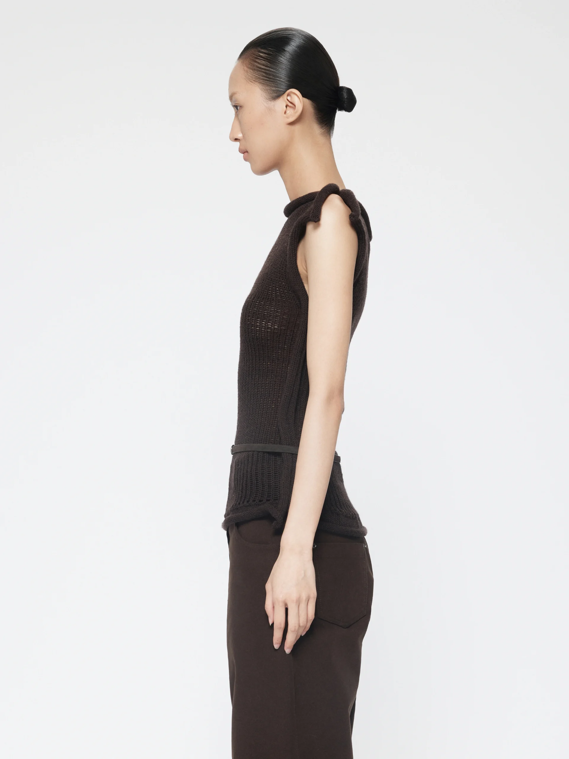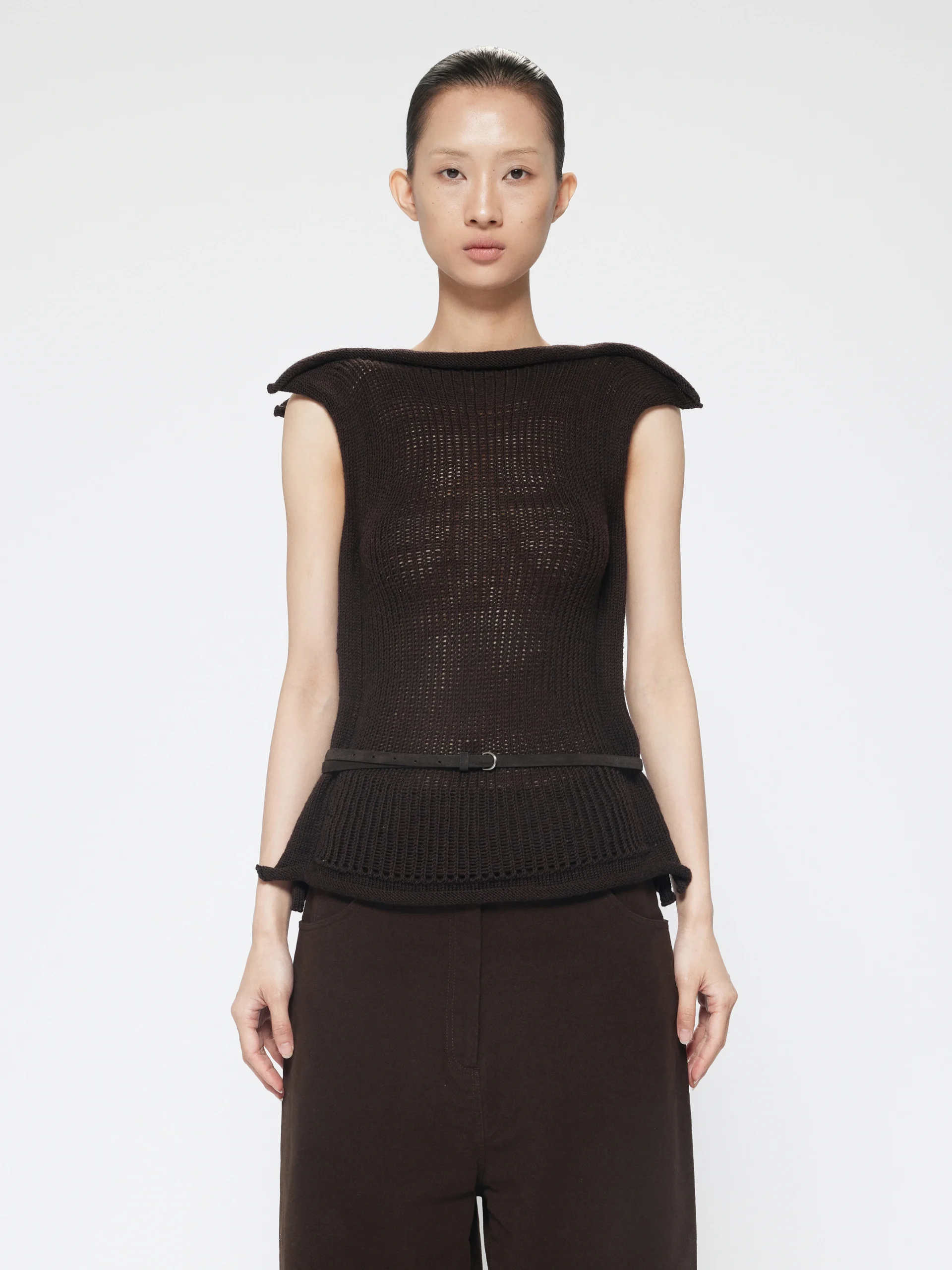 GIA STUDIOS’ Roy top is hand-crocheted in two pieces, featuring a bateau neckline and sleeveless design with softly sculpted edge.