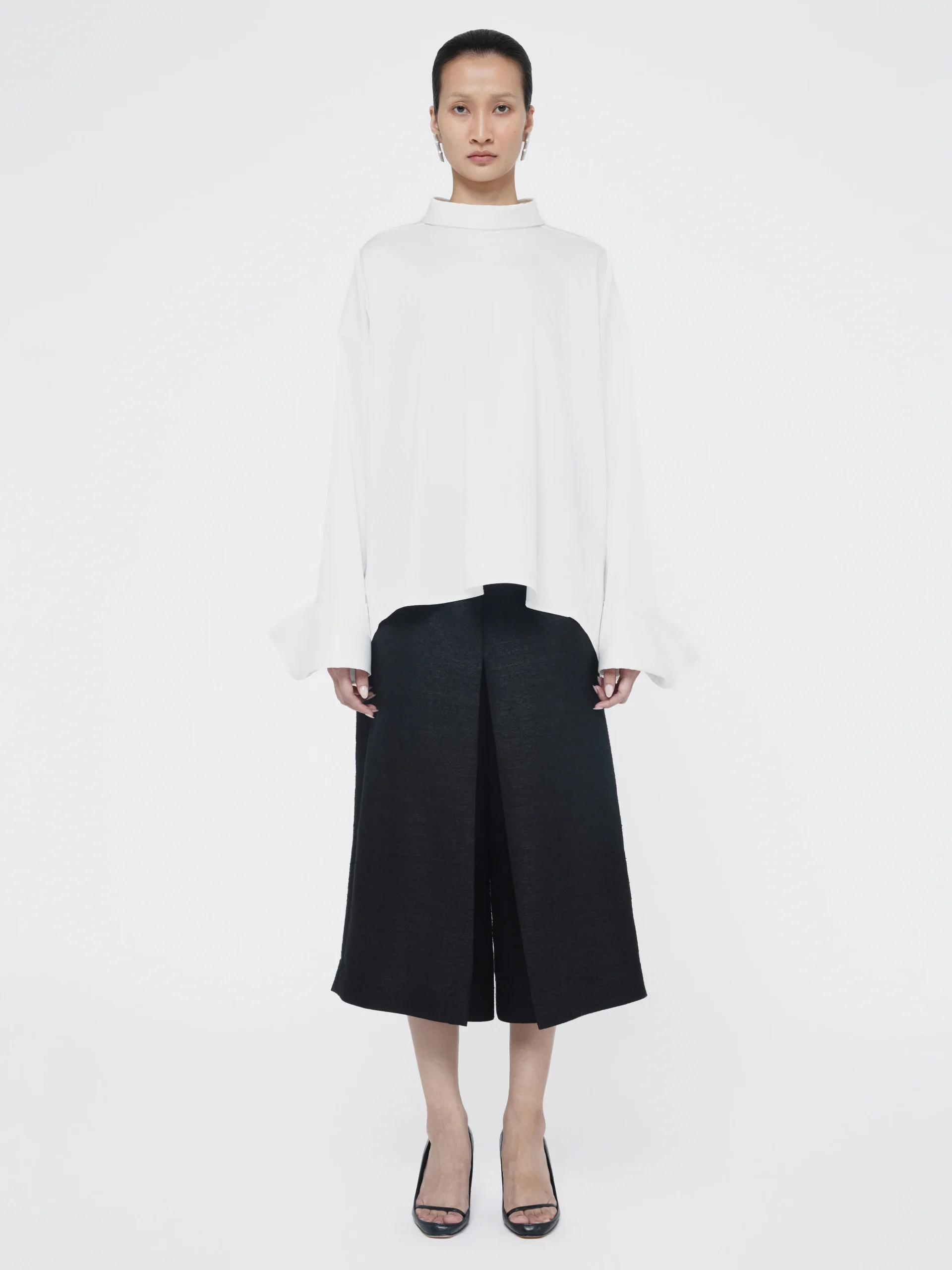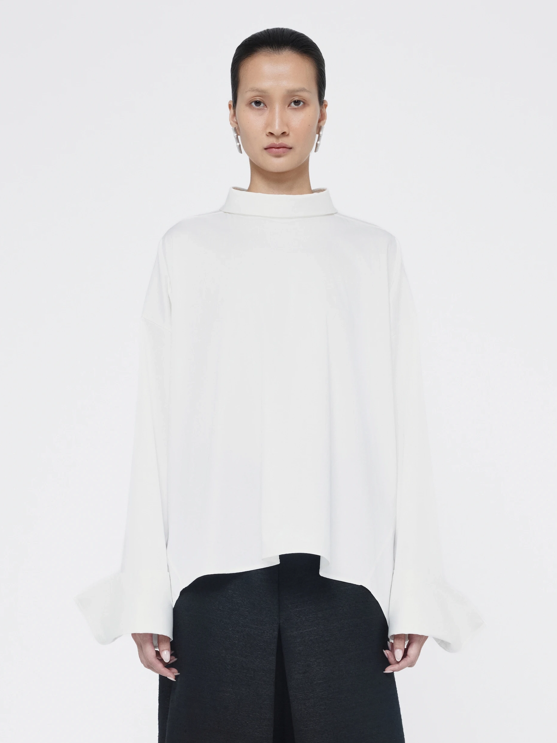 A longer front and shorter back shift the proportions in cotton with a touch of elastane. Roy reversible shirt can be worn either way, pairing easily with trousers or skirts and flats.