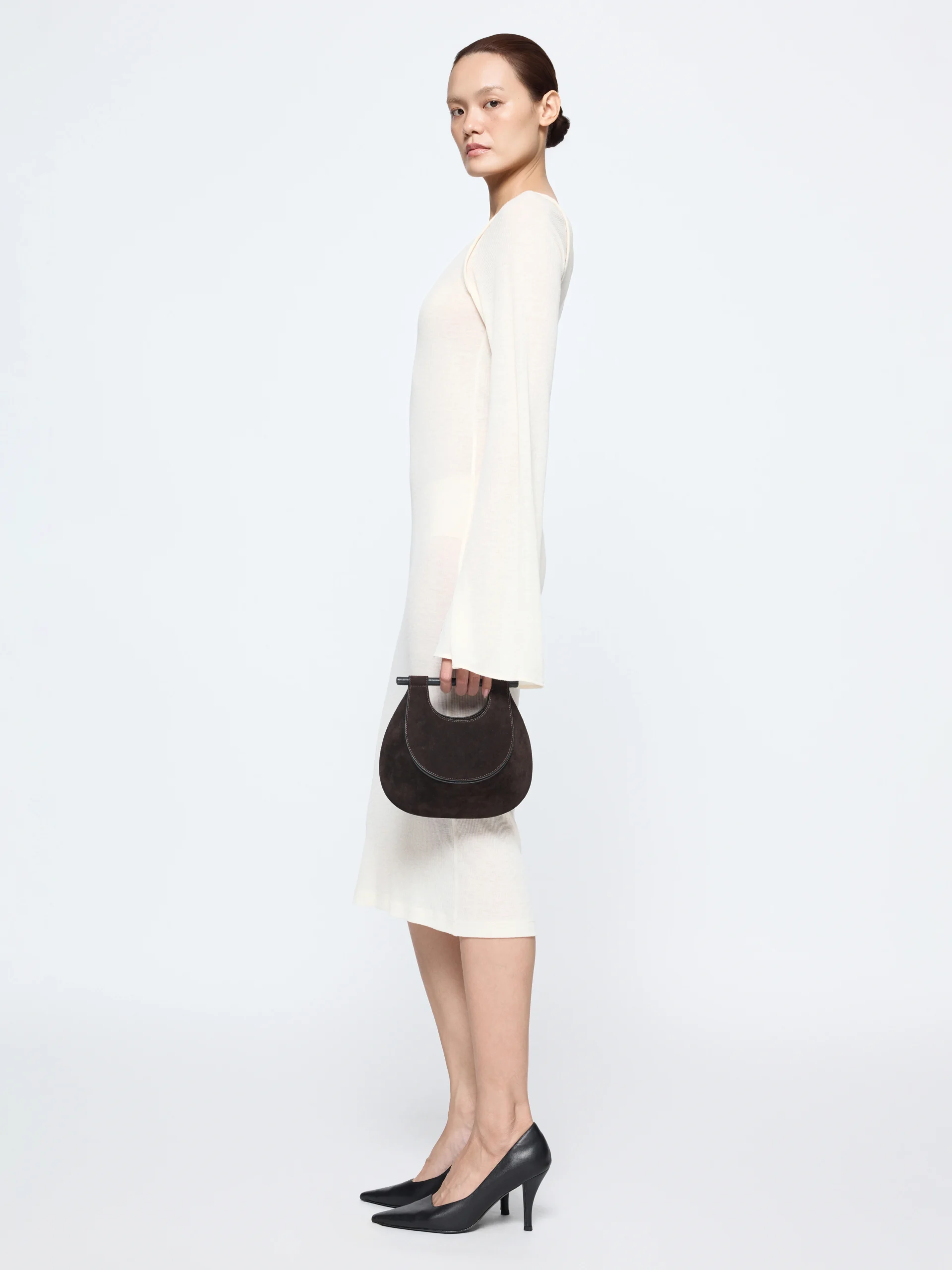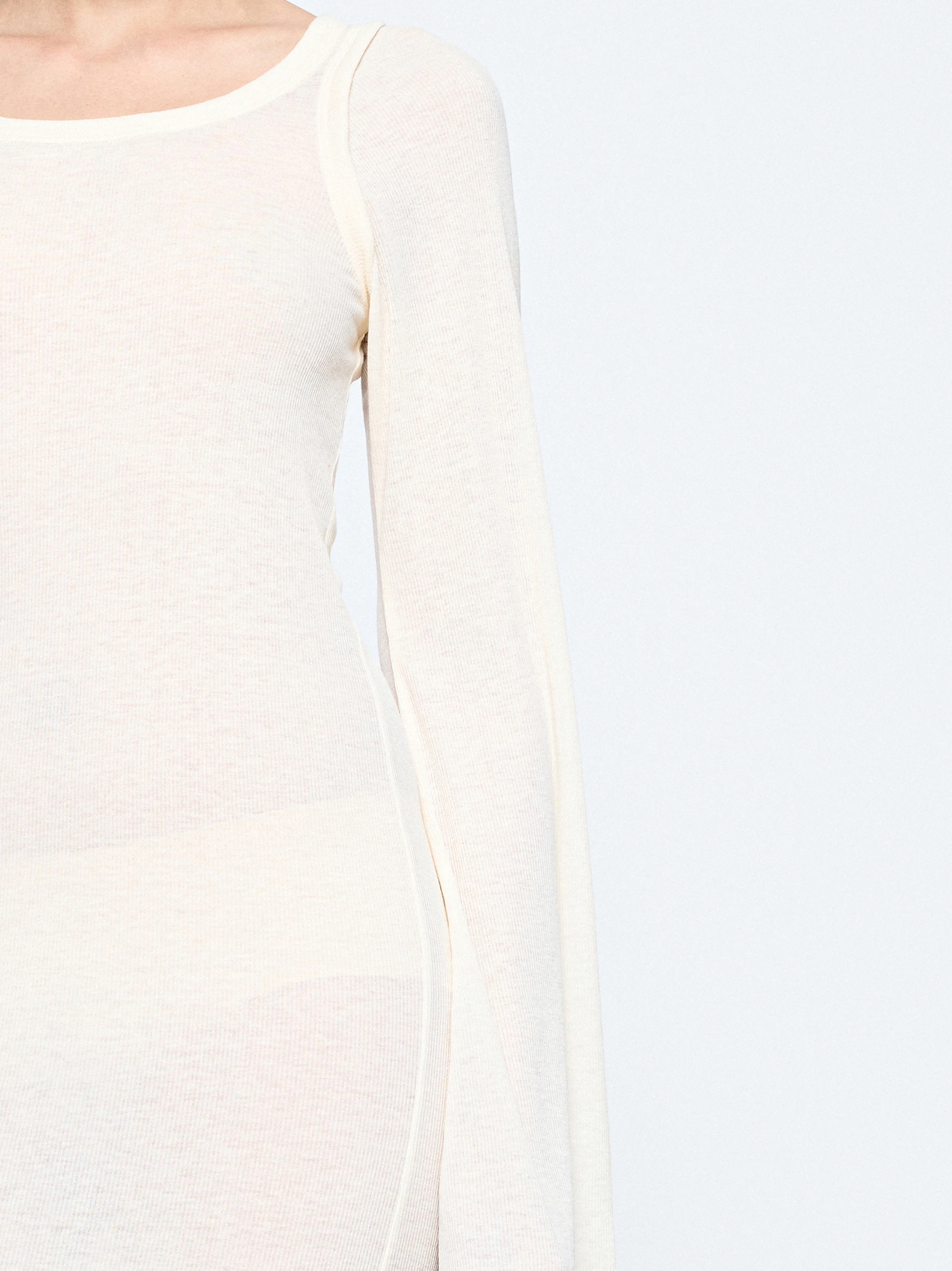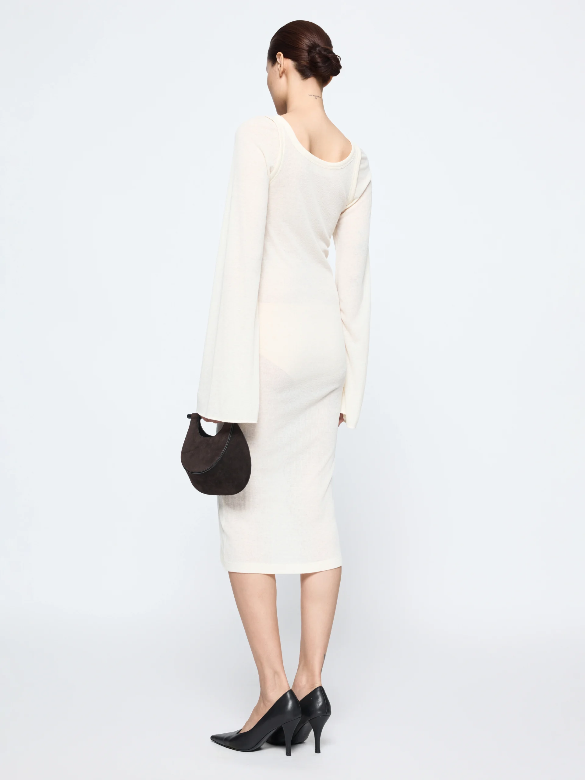 The GIA STUDIOS “Sola” dress is cut from an ivory wool blend that feels light against the skin. It’s shaped close to the body with a deep U-neck and long sleeves that flare open at the wrists.
