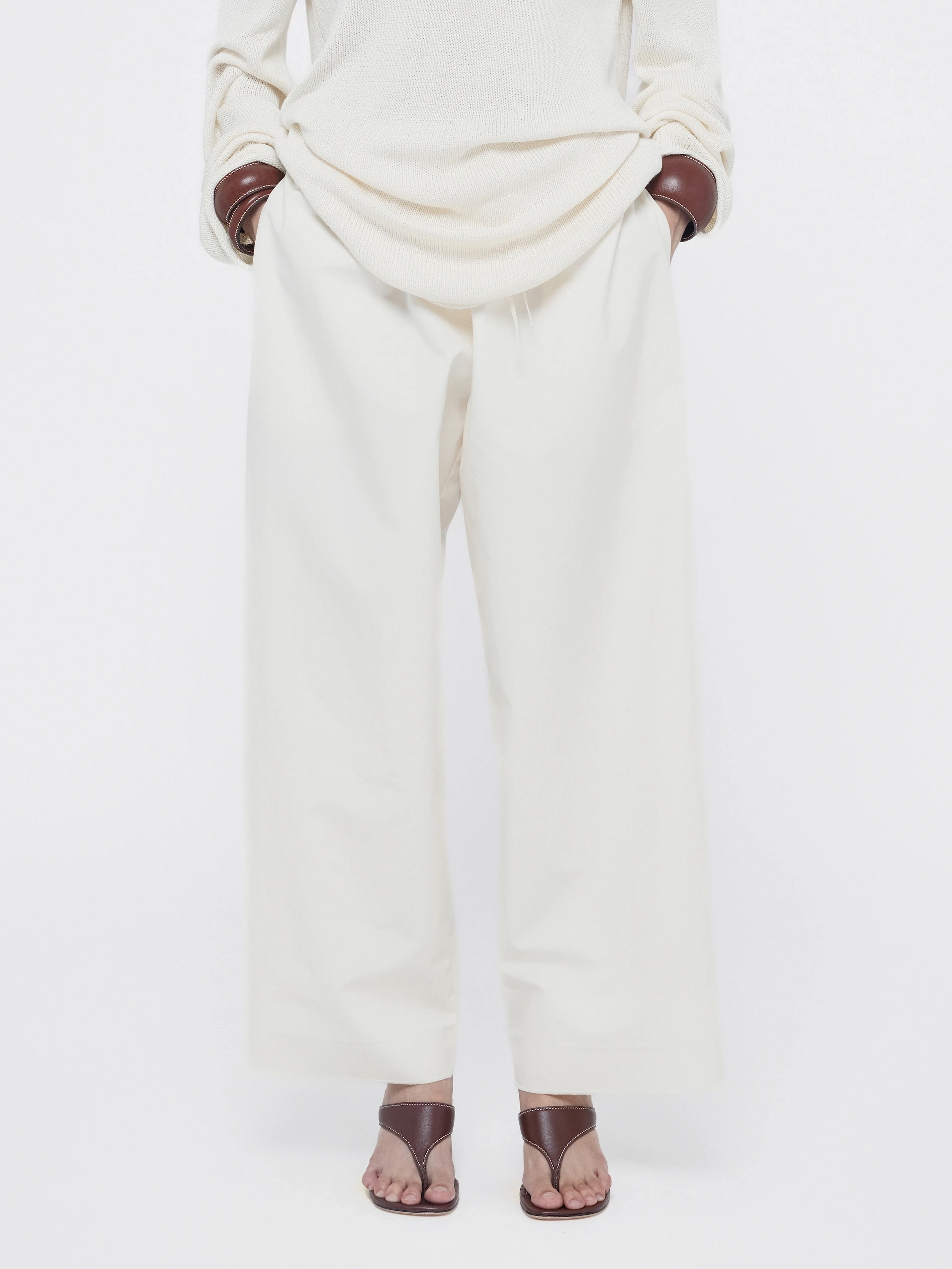 Soft yet structured, wide-leg Tom trousers combine heavy cotton with silk lining for tactile contrast. Pair with the Lissey tunic and minimalist accessories for layered, refined Gia Studios styling.