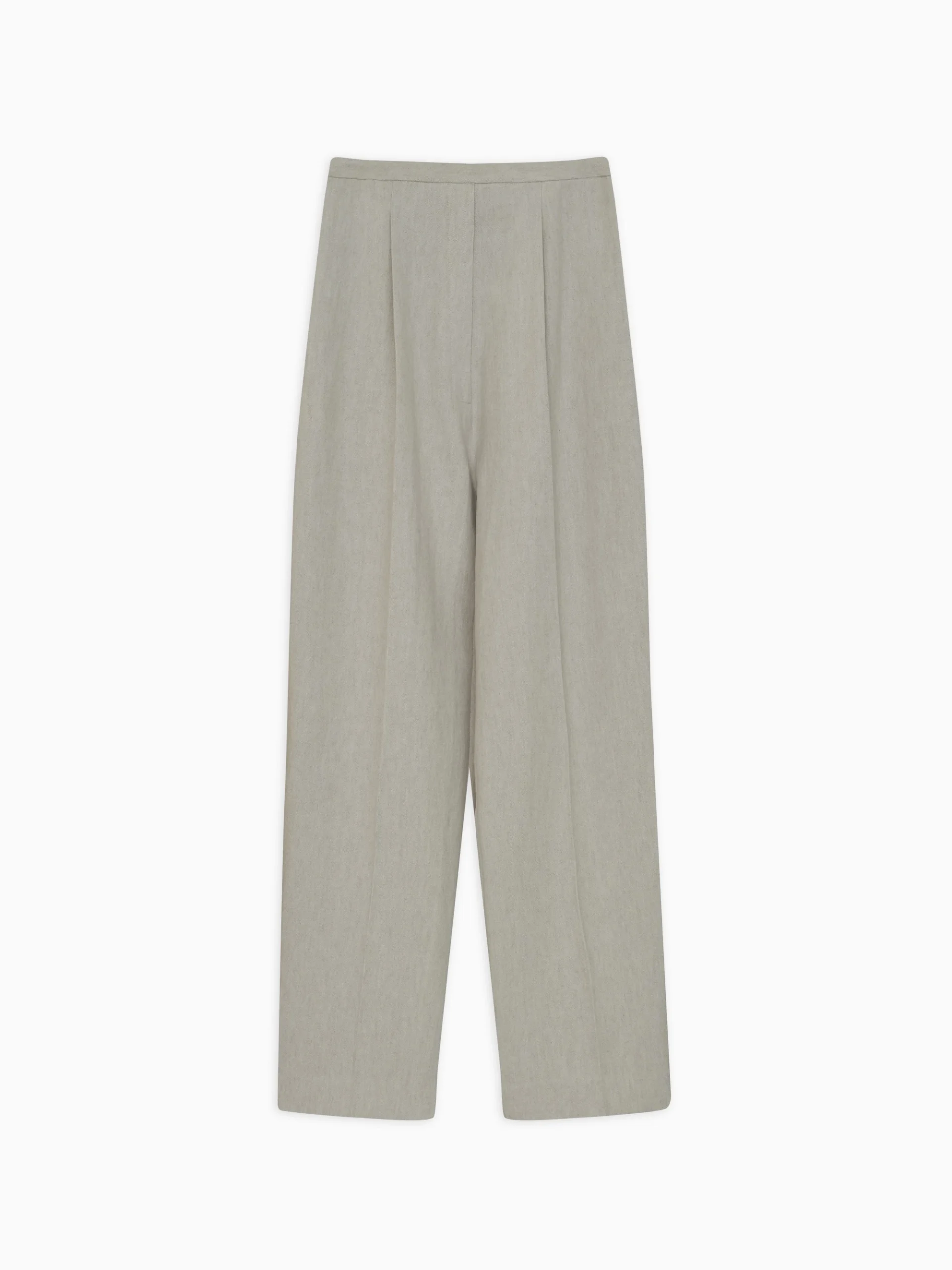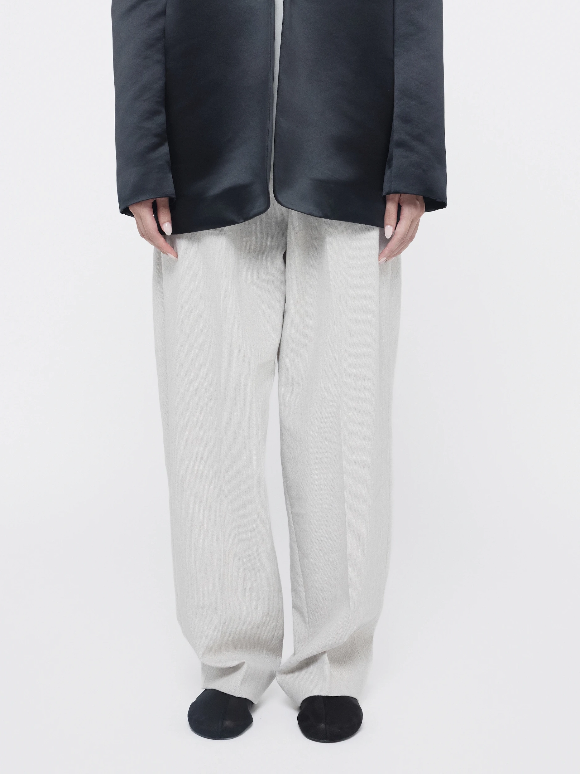 Linen-polyester weave balances structure and ease, with silk lining offering a gentle glide. Tomas cocoon trousers follow a tapered cocoon form, creating understated movement.