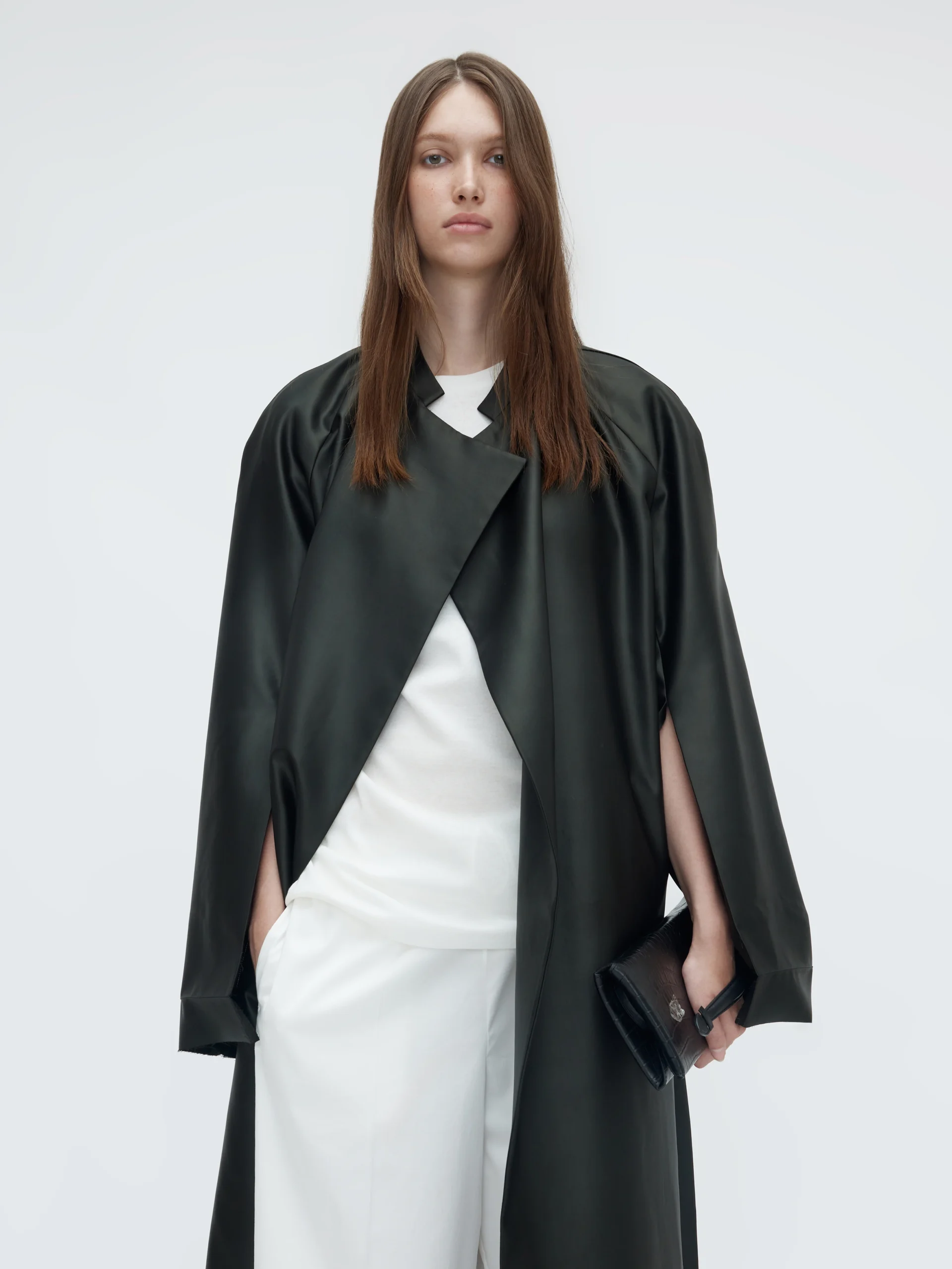 Hand-finished lacquer silk shapes the ‘Trula’ coat’s fluid form, its deep black sheen and broad belt echoing Vietnamese craftsmanship.