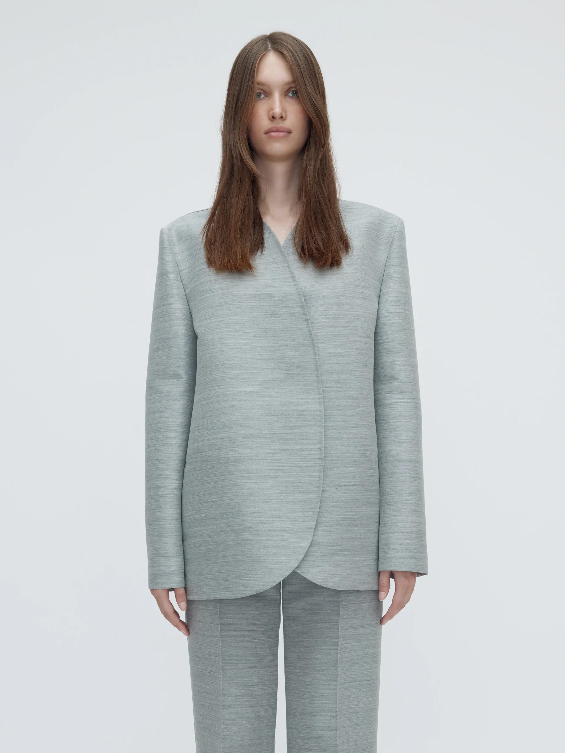 Inspired by the gentle geometry of a tulip, the ‘Tulip’ jacket features an oversized, sculpted silhouette, softly lifted by silk–wool for natural volume and effortless movement.