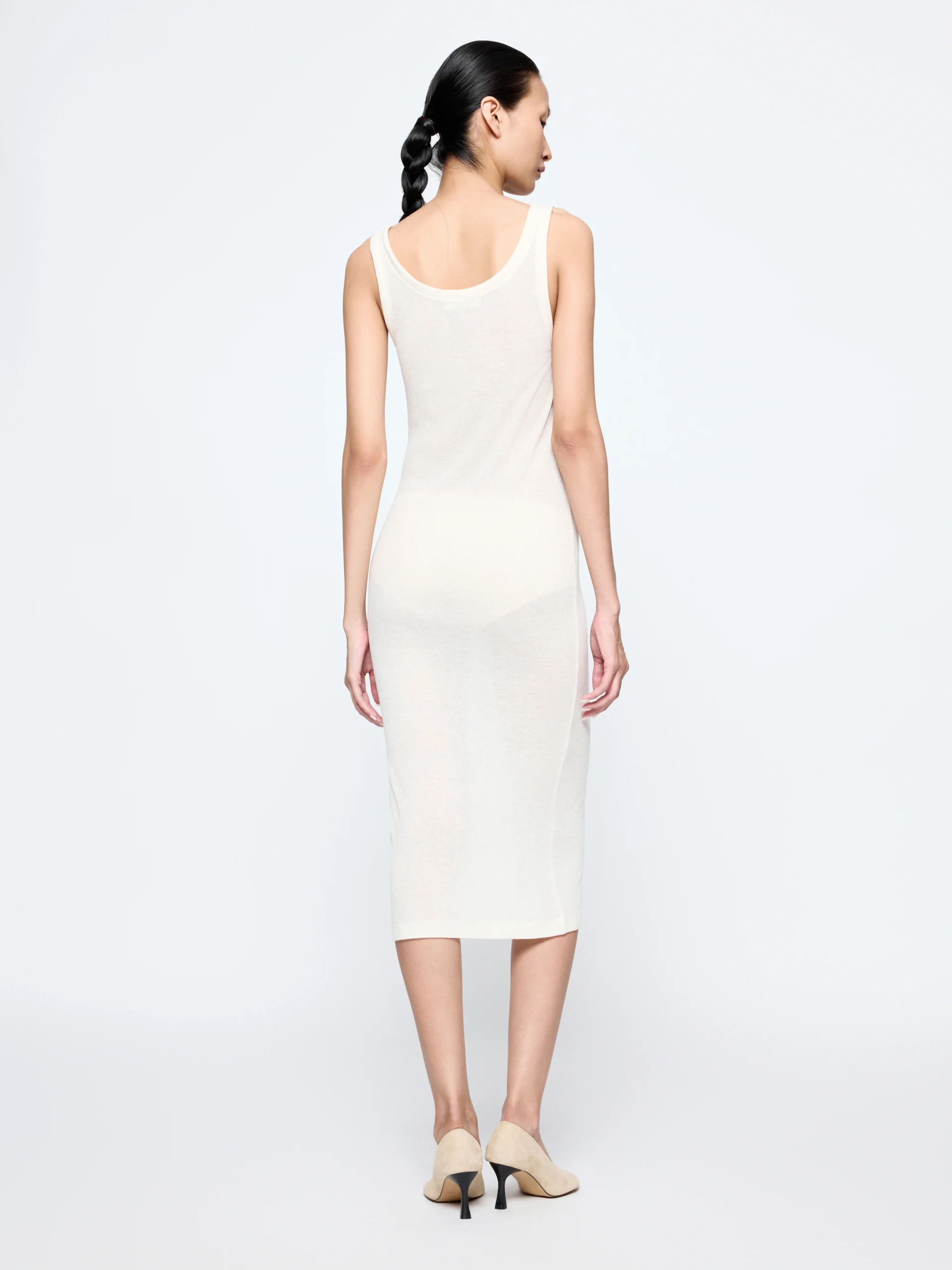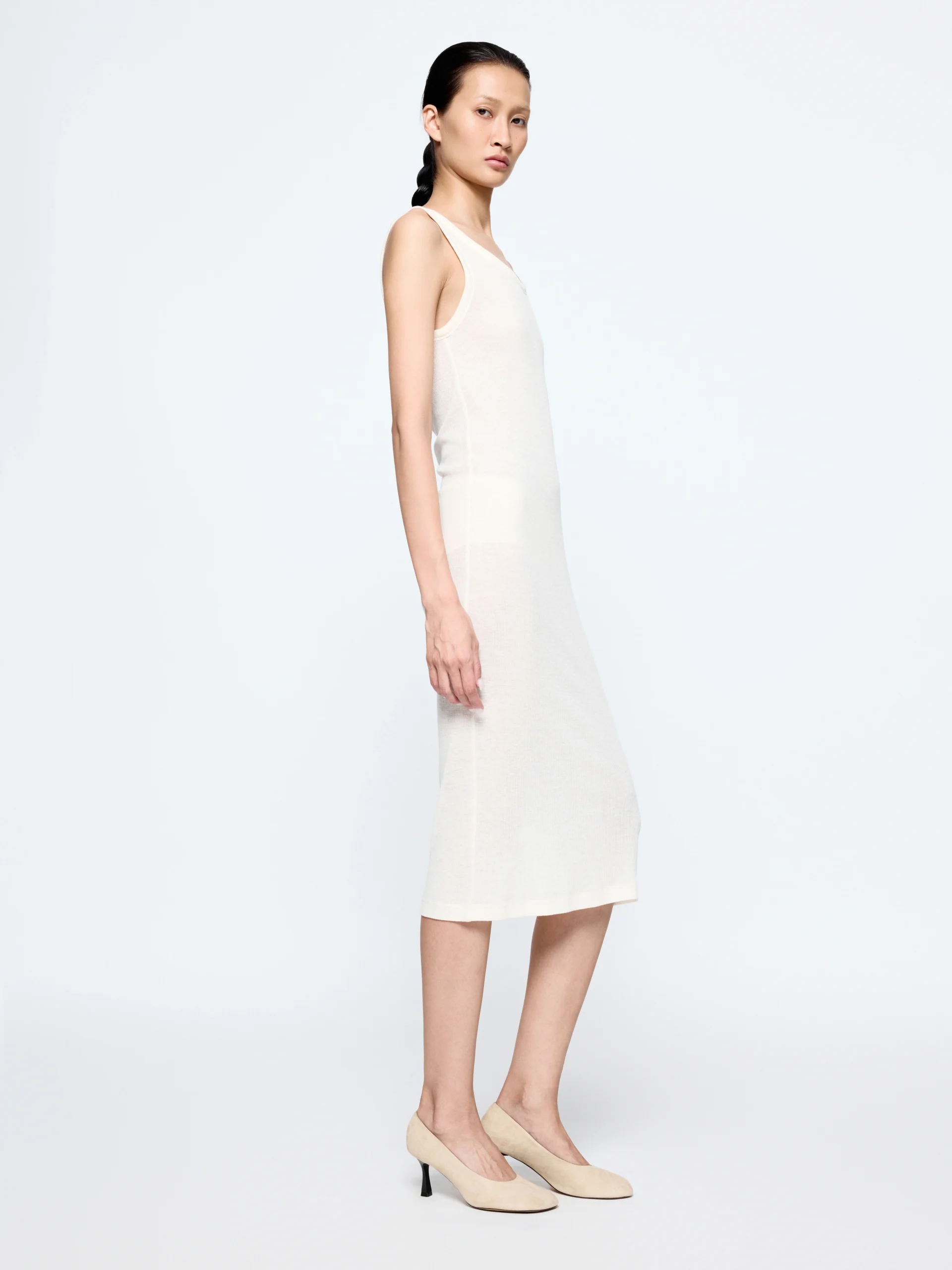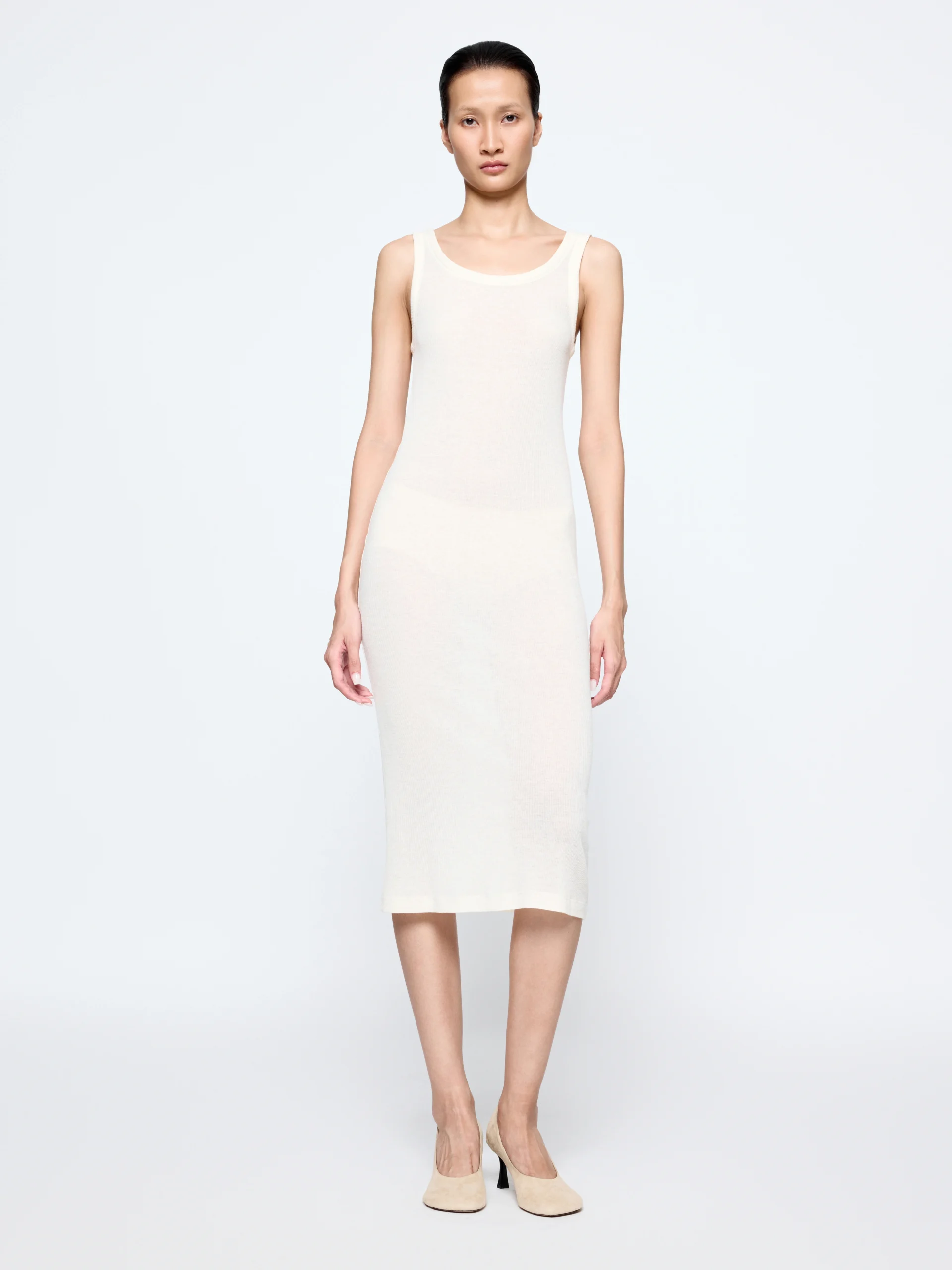 The “Wren” dress has a streamlined shape in a wool blend that gives just enough structure while staying light to wear. It works both as a standalone piece and as an inner layer for seasonal styling.